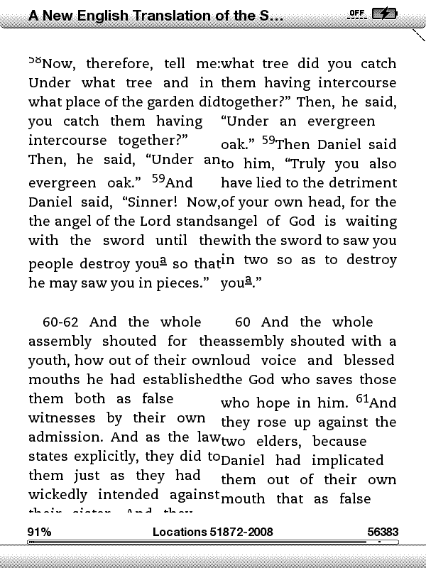 I've attached a screenshot from a all-to-typical page from an eBook I just purchased through Amazon. The book is: A New English Translation of the Septuagint. I find such formatting to be totally unacceptable. Notice how the columns are smashed together and how half of the bottom line is missing.