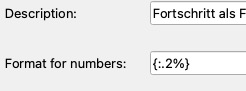 At the "format for numbers" fill in {:.2%} -> for floating point progress, change the 2 to 1 if i remember correctly to get 30% or respectively 100%. With the 2 you get 100.0%. Hope that helps! |