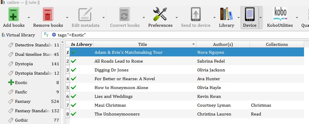 I've been successfully using Kobo Utilities to update metadata for 1,5 year. The past days (I don't know how many, maybe since the last day's update), it doesn't update the tags. It just says "Books updated=0". I have decided to change up my tags and about 300 aren't updated. It does update changes in summary. It's something weird, because the new tags are visible in the Device Tags in Calibre, and they show books in them. But the books themselves aren't shelved in the device (see in the attached image). I have tried uninstalling and installing KU, disconnecting and reconnecting the KL2, powering it off and on. The Automatic Management of Calibre in enabled, but I don't think that it has ever worked. I have NickelMenu installed for months. Is there anything I can do to update my device? TIA |