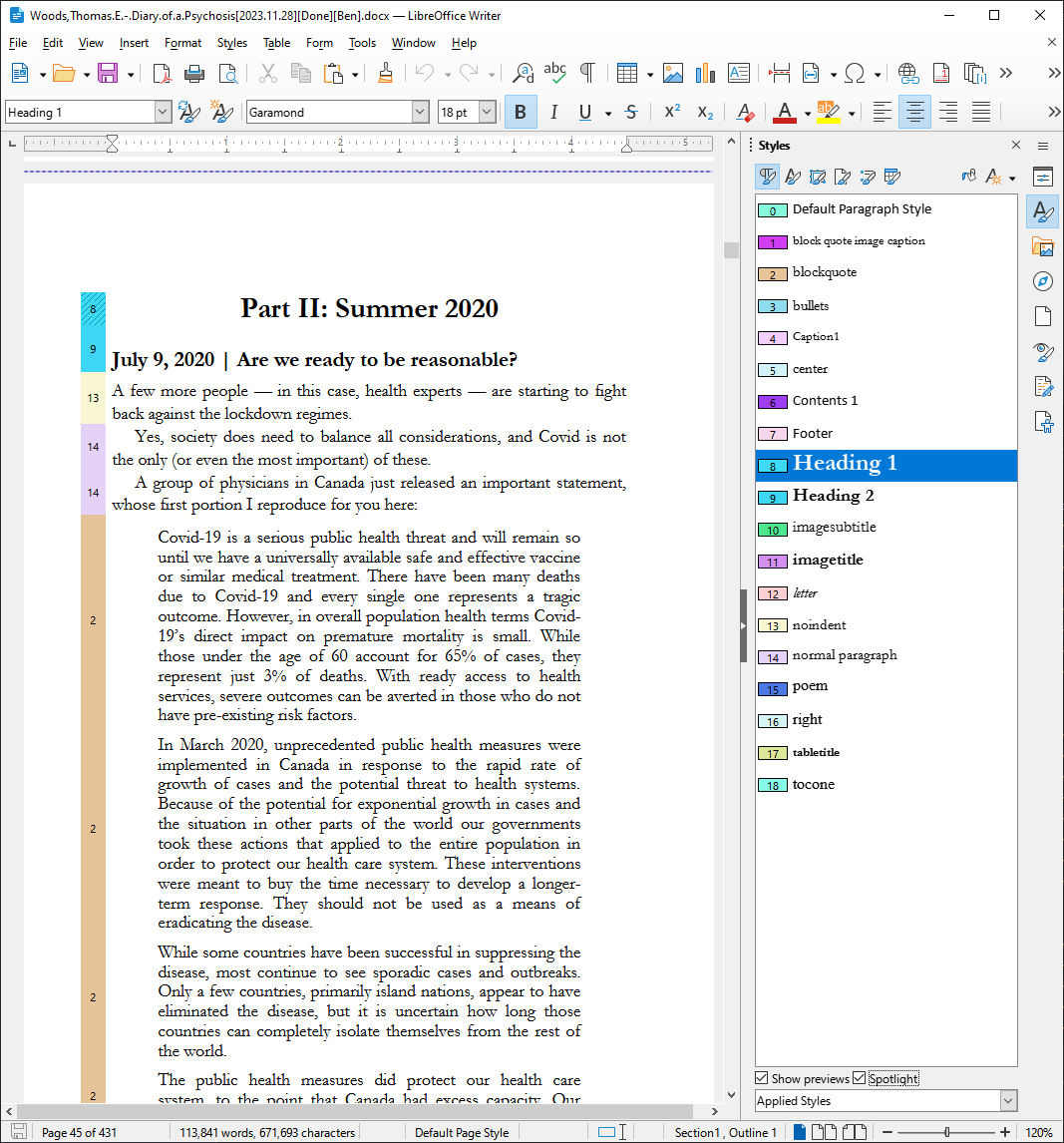 That'll lead you to hundreds and hundreds of posts where I/we covered this topic in detail over the years. ![]() - - - Side Note: And, make sure you're on the latest LibreOffice 7.6. They added this really fantastic "Styles Highlighter" feature called "Spotlight": You get to it by: