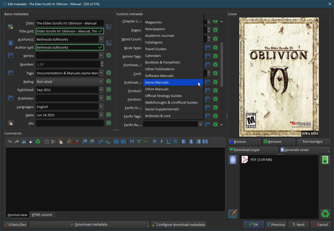 Except for Author and Title, I don't believe the Police will seek you out for leaving fields blank. ![]() In case of Manuals: if the author is not specified, I use the Publisher there also (sometimes embellished ). eg LG Staff I also tag the document: UG (users Guide), QSG (Quick Start Guide), IG (Installation Guide), Wnty ... I even use 'Series' to tie a set together (LG BD [0]) |