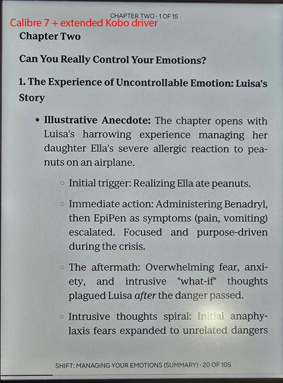 I downgraded Calibre to 7.26 and used the old way to send the exact same book to my device. Here's the outcome, and a comparison image.