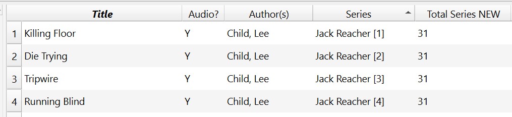 ![]() ![]() ![]() ![]() ![]() This is fantastic, thank you so much. I added an empty book to the Jack Reacher series and calibre immediately populated the column for that book with the maximum index number. There was no lag (1,350 books) After a re-start all books in the series were updated. When I deleted the empty book and restarted calibre, the field automatically updated again Thank you to everyone who has help me with my query |