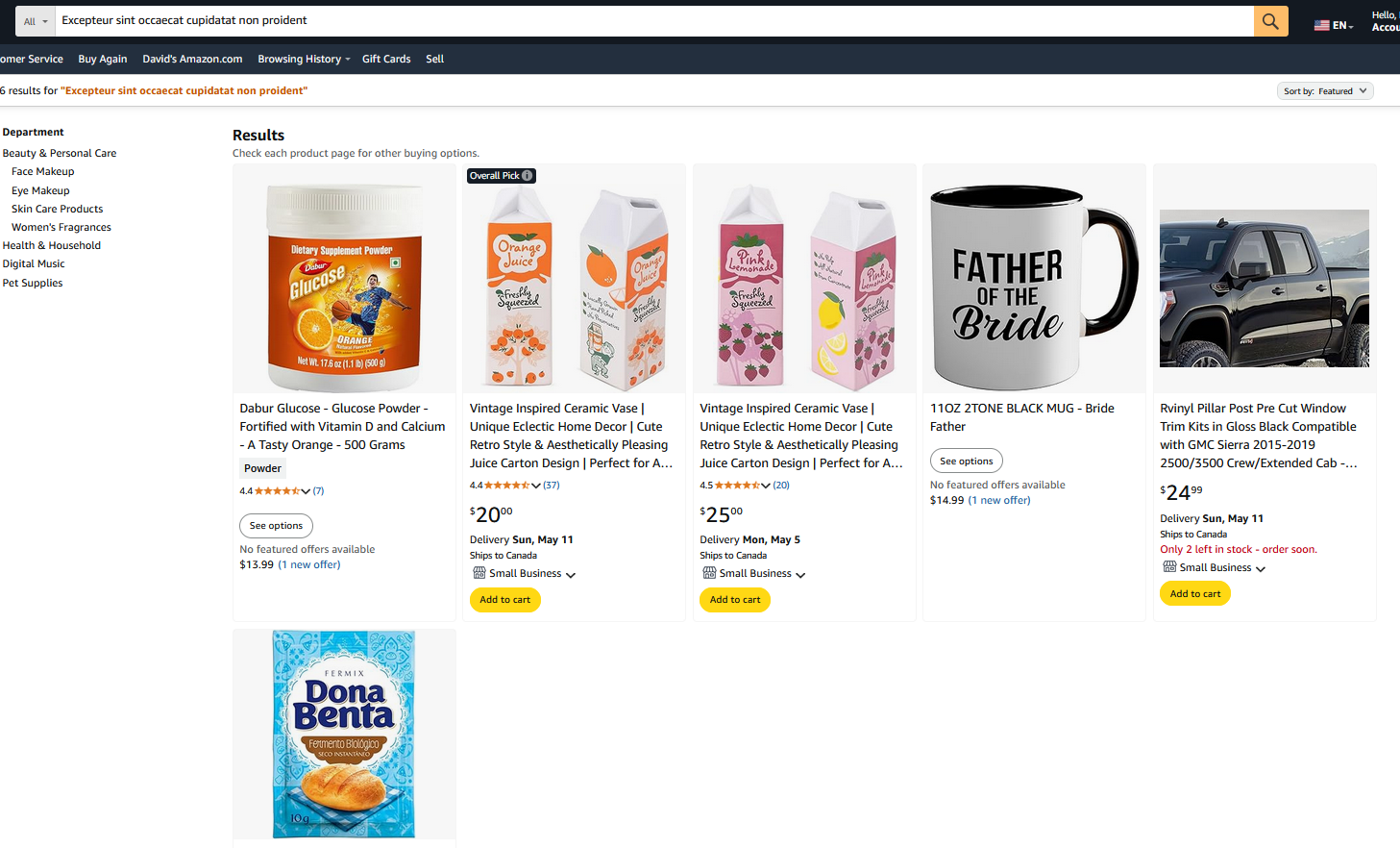 Talking about Amazon search, I am still surprised by the difference between search results on Amazon.com and Amazon.ca. Amazon.ca seems willing to admit that no search results were found while Amazon.com found 6 results for my search on "Excepteur sint occaecat cupidatat non proident" which I lifted from a Lorem Ipsum page. Oddly, Amazon.ca had 5 of the 6 items so how does Amazon.com match them while Amazon.ca does not?