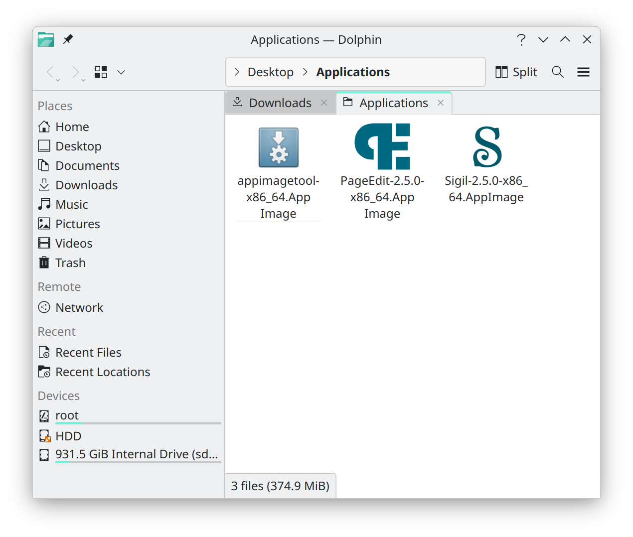 They also seemed to want them in my ~/.local/share/applications/ folder not the ~/.local/share/apps folder (the former is specified in the XDG desktop spec). Then to get the icon to show up on the AppImage in the Dolphin file manager, I had to install the libappimage package and make sure in the Dolphin Configure page to enable Previews of AppImages. Now I have a wonderful Applications folder on my Desktop where all my AppImages are located. KDE Plasma 6 with AppImages is beginning to look more like my MacOS Desktop which is a nice thing for muscle memory. Quote: