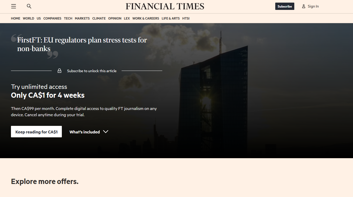 https://www.ft.com/content/186719a6-...5-4cba5ad7612d the browser display: "Subscribe to unlock this article Try unlimited access Only $1 for 4 weeks Then $75 per month. Complete digital access to quality FT journalism on any device. Cancel anytime during your trial. " |
