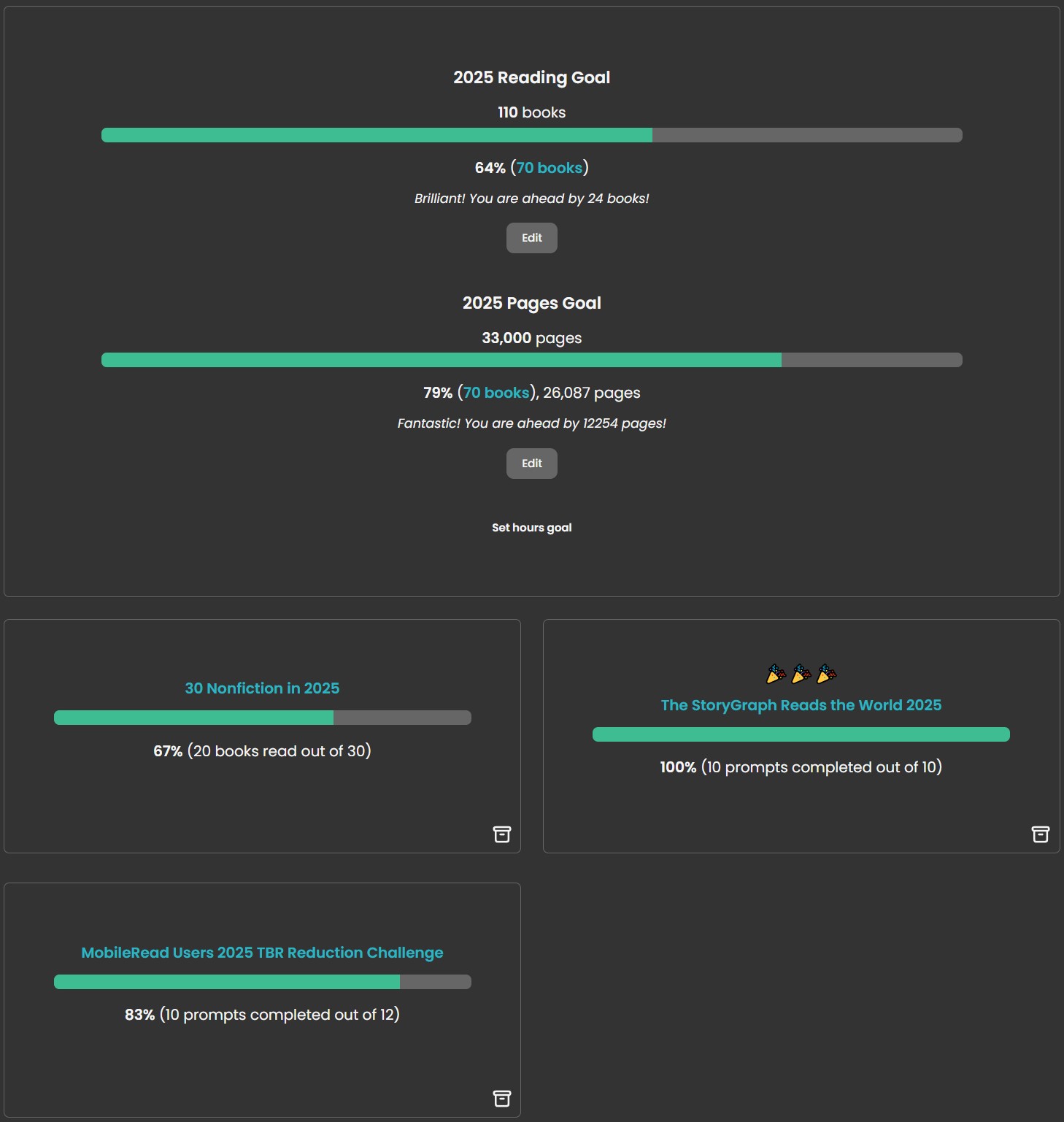 60 books: 18 On Track 20,000 pages: 7,317 On Track 4 books over 600 pages: 1 On Track |