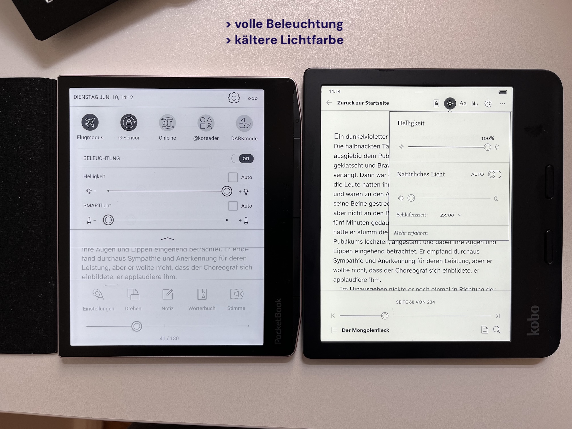 Which one will it be? I’m still testing, but I’m leaning toward the Libra 2. The reason is much more significant than I expected: the display! I had the PocketBook Era first and was very satisfied with it. But when the used Libra 2 arrived – what an eye candy (the display)! Ever since, I notice the darker screen on the Era more and more while reading, and I’ve been reaching almost exclusively for the Libra. The Era’s screen feels dull and "greyish" in comparison (hard to describe), so I turned up the brightness. But then it loses the "paper look" and starts to "glow" too much for my likings. I should mention that I mostly read indoors, usually in bed with a bedside lamp. Had I never tried the Libra 2, I probably wouldn’t have noticed – so in my opinion, the difference here isn’t between bad and good, but between good and very good. I think I’ll part with one of them and sell it used in 2–3 weeks. Until then, I’ll continue testing both thoroughly. Here are a few comparison photos: with no light / low light + warm or cold / full light + warm or cold (the phone camera of course doesn’t capture the lighting & color tones naturally) |