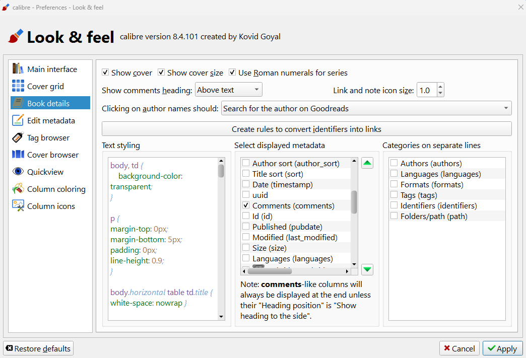 The downloaded metadata does not show on the right hand side of interface. On the left I can see title and author of book thats all. Right side is blank.
