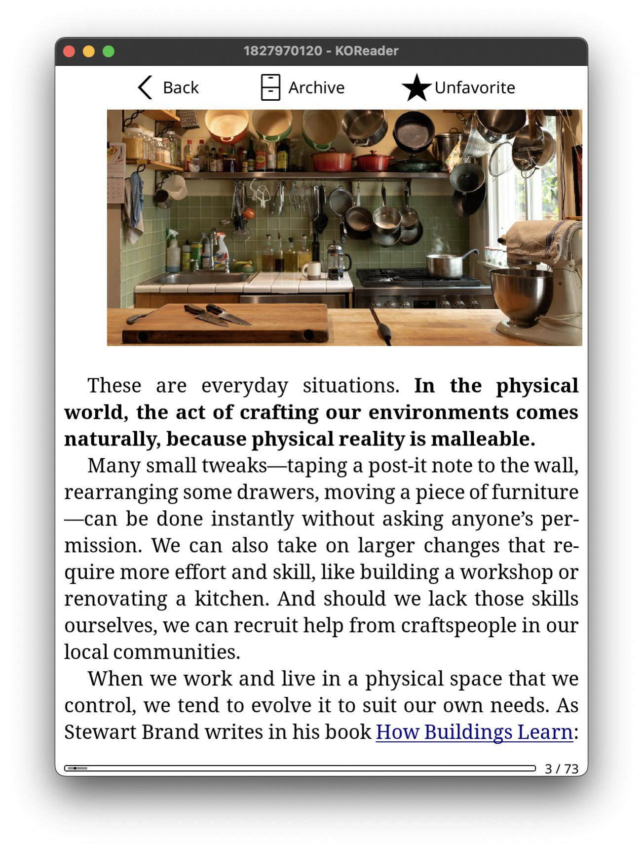 KOReader runs on multiple platforms and therefore interests more than just Kobo users. Not only that, but its plugin system does not even require a clone, or even a compile! Their devs might have tips if you have a specific question about the debug process. Not only that, but there already IS a wallabag plugin! The Kobo forum is relevant because Pocket users could give insight into their use patterns. There is in fact no shortage of Read-it-Later options - I've run a Shiori server and client on my Clara HD, modded a KOReader routine to execute an html-to-epub converter, and others just use Calibre or desktop plugins to save as epub to the cloud, for examples. The devil is in the details of what people find convenient. Some options out there: https://github.com/go-shiori/shiori#readme https://codeberg.org/bins/sako-plugin * Oh yes, there is also rmkit (C++), a super cool platform that supports some Kobo and Remarkable devices and has room for a spiffy read-it-later app. ** Actually, there is a great Gemini protocol (Simplified web protocol, not the AI engine) KOReader client, so you could contribute to the http/html to gemini proxies that already exist and help the battle against web bloatware! Last edited by elinkser; 06-13-2025 at 10:19 AM. Reason: rmkit/gemini protocol |