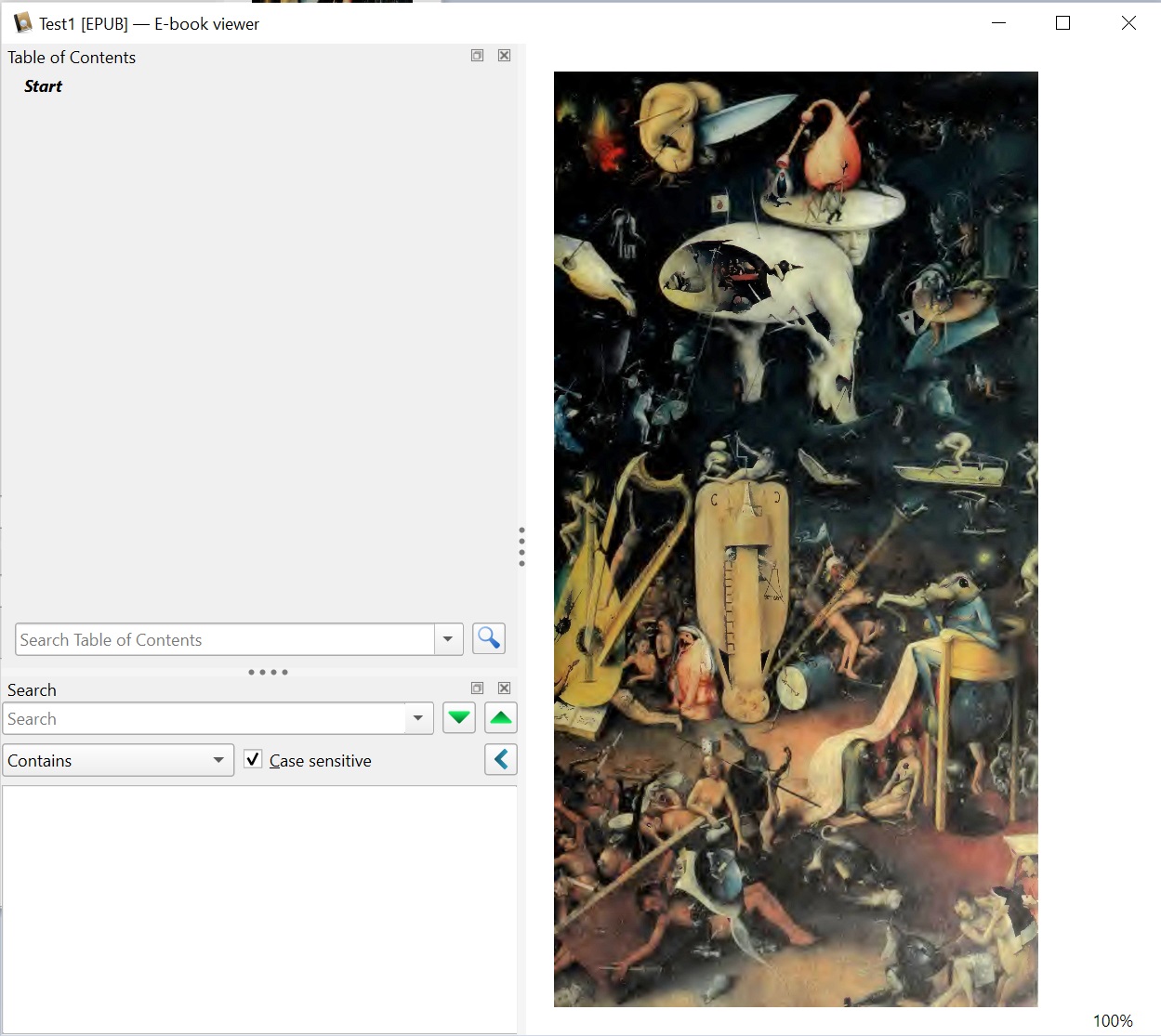 So, to be clear, I don't have a problem with the scrollbar per se. I mean, if it is necessary to see the whole image then I definitely want it! What I think I'm seeing now is that even at 100%, the vertical scroll bar is actually just showing a sliver of white space below the image, not actually revealing any more of the image (and i assume this is what you mean by "that means nothing"). So what's really happening (I think...???) is that the picture IS 100% of the window height... its just that the container is greater than 100% of the window height, hence the extra little sliver of whitespace that results in the scrollbar (unless you hide "overflow"). Regarding how the two programs render it, I'm seeing that Calibre proportionally resizes the image when you narrow or widen the window, but Sigil stretches the image if you widen the window (which you alluded to in your first post). If you set the image width to "auto", again, Calibre proportionally resizes the image when you widen or narrow the window. Basically, it doesn't allow for overflow—hidden or not. In Sigil/Preview, widening the window preserves the aspect ratio just fine, BUT narrowing the window results in the left side of the image being cut off (presumably because the overflow has been hidden). Now.... here's where things go completely off the rails. If I use the attached "Test1" file which seems to be the same as yours except that I've switched out your image for my image, setting width to "auto" results in a squishy image in Calibre! If i change your image to "auto", it resizes perfectly in Calibre (but cuts off the image in Sigil); if i use the same code on MY image, it gets squished in Calibre. I've attached both your file (modified to "auto") and mine... P.S. one important thing I learned is that <p> has embedded margins, while <div> does not, so I've changed that container for the image itself, as per your example. P.P.S. Does anyone here know how we can just instantly upload knowledge to our brains as in The Matrix? That would save me a lot of time. kthxbye. Last edited by ElMiko; 06-14-2025 at 08:23 PM. |