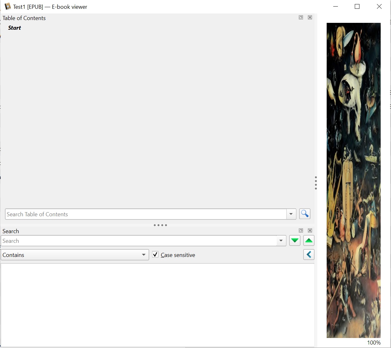 So, to be clear, I don't have a problem with the scrollbar per se. I mean, if it is necessary to see the whole image then I definitely want it! What I think I'm seeing now is that even at 100%, the vertical scroll bar is actually just showing a sliver of white space below the image, not actually revealing any more of the image (and i assume this is what you mean by "that means nothing"). So what's really happening (I think...???) is that the picture IS 100% of the window height... its just that the container is greater than 100% of the window height, hence the extra little sliver of whitespace that results in the scrollbar (unless you hide "overflow"). Regarding how the two programs render it, I'm seeing that Calibre proportionally resizes the image when you narrow or widen the window, but Sigil stretches the image if you widen the window (which you alluded to in your first post). If you set the image width to "auto", again, Calibre proportionally resizes the image when you widen or narrow the window. Basically, it doesn't allow for overflow—hidden or not. In Sigil/Preview, widening the window preserves the aspect ratio just fine, BUT narrowing the window results in the left side of the image being cut off (presumably because the overflow has been hidden). Now.... here's where things go completely off the rails. If I use the attached "Test1" file which seems to be the same as yours except that I've switched out your image for my image, setting width to "auto" results in a squishy image in Calibre! If i change your image to "auto", it resizes perfectly in Calibre (but cuts off the image in Sigil); if i use the same code on MY image, it gets squished in Calibre. I've attached both your file (modified to "auto") and mine... P.S. one important thing I learned is that <p> has embedded margins, while <div> does not, so I've changed that container for the image itself, as per your example. P.P.S. Does anyone here know how we can just instantly upload knowledge to our brains as in The Matrix? That would save me a lot of time. kthxbye. Last edited by ElMiko; 06-14-2025 at 08:23 PM. |