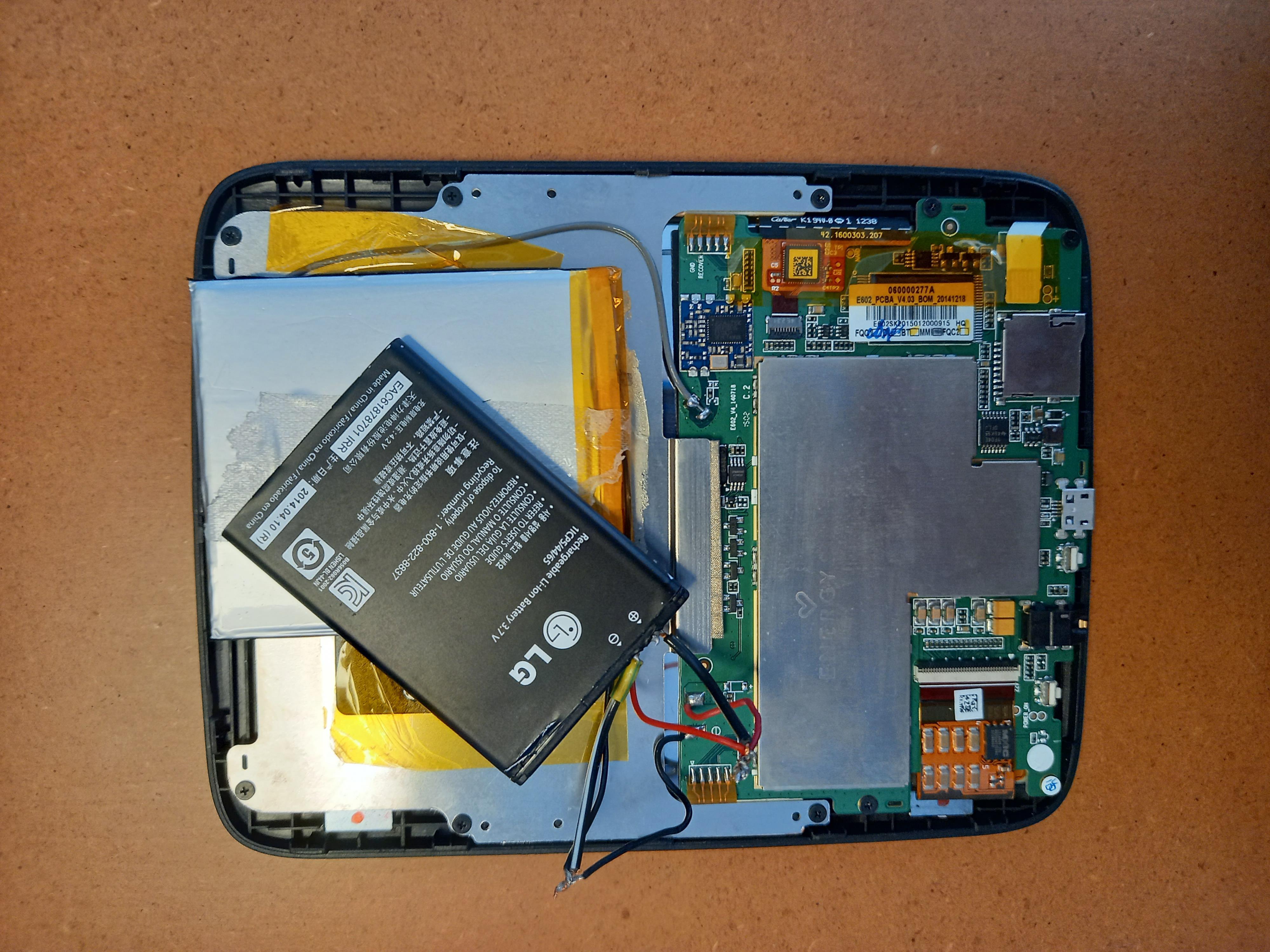 Brand: Energy System. Model: E-reader Pro (Boyue T62 clone). OS: Android 4.2. Original battery: 3.7V / 2800mAh. I bought it in this condition, not working, with the fixed "I need battery" screen. The battery was swollen, for disposal. I've tried two 3.7V batteries in parallel, but it doesn't respond. If I connect it with a cable to the PC, it detects a "RockUSB device", but not a disk drive in Explorer. Before I throw it away, any ideas? |