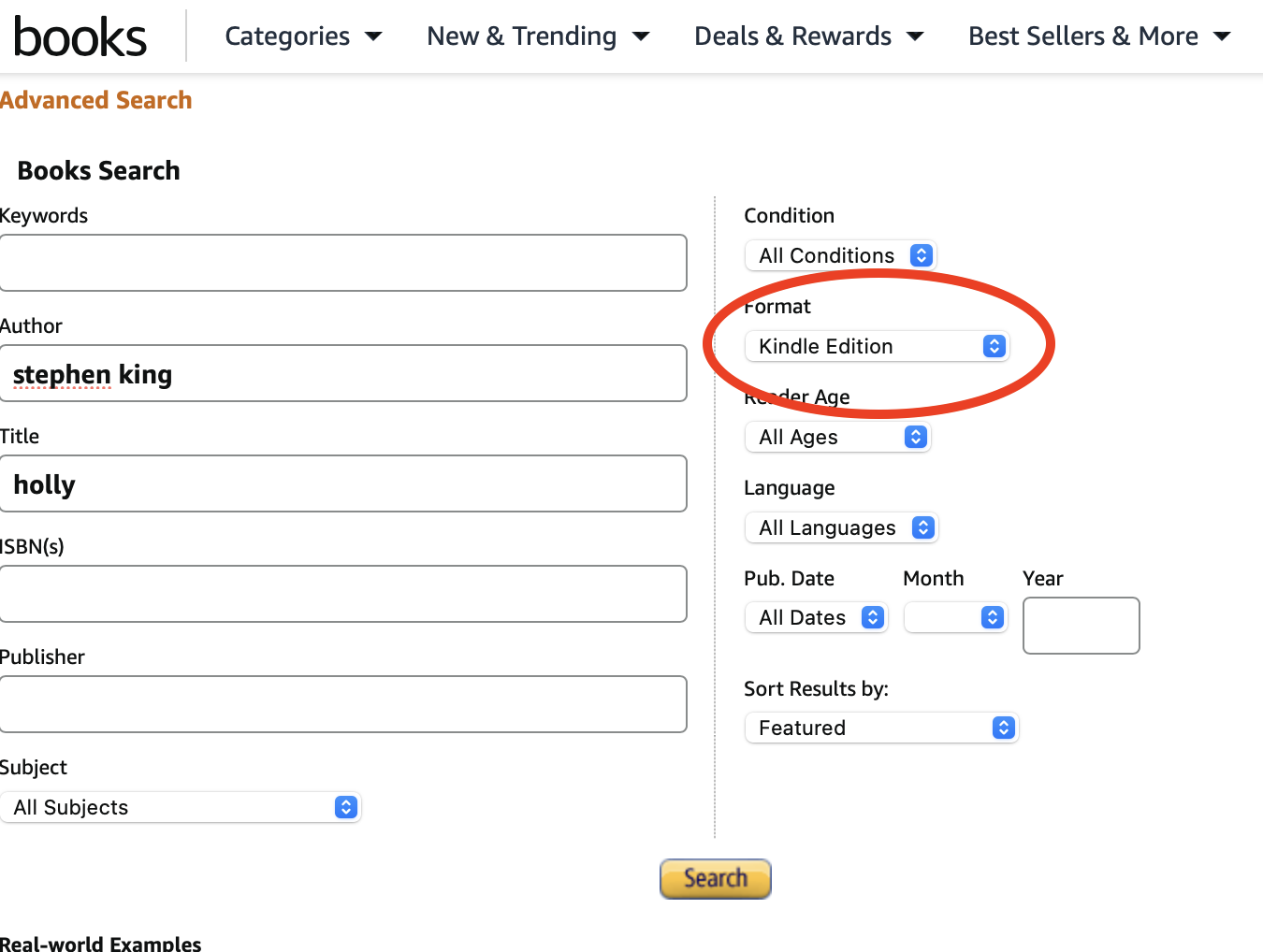 https://www.amazon.com/s?k=holly+stephen+king something like https://www.amazon.com/s?k=holly+stephen+king+kindle will be better |