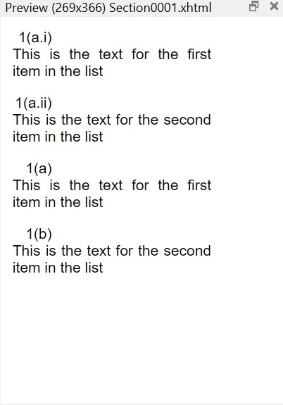 <p class="list"><span class="col1">1(a.i)</span><span class="col2">This is the text for the first item in the list</span></p> <p class="list"><span class="col1">1(a.ii)</span><span class="col2">This is the text for the second item in the list</span></p> <p class="list"><span class="col1">1(a)</span><span class="col2">This is the text for the first item in the list</span></p> <p class="list"><span class="col1">1(b)</span><span class="col2">This is the text for the second item in the list</span></p> Code: