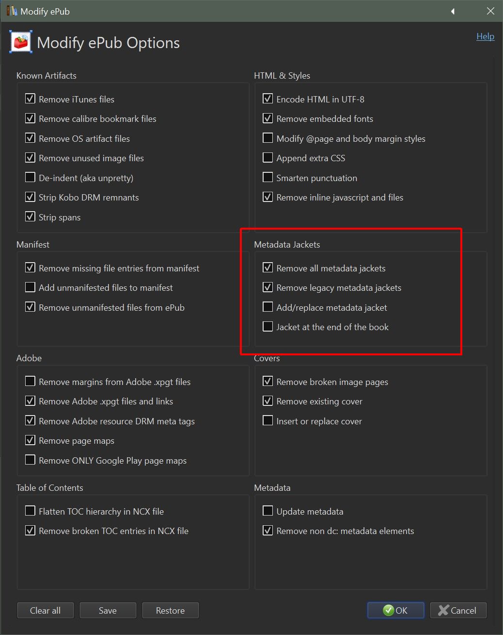 Hi, folks. As a longtime Calibre user (almost since its inception) I have, of course, tinkered enough with my library that I have re-converted everything multiple times, going to various formats. Since my preferences were always set to place summary metadata at the front of the book, I have ended up, suddenly with books that have the metadata three or four times in front of the book. I wish there were a button for this in Quality Check. Is there some way to remove excess metadata summaries from multiple books without editing them one by one? This is not a huge deal, but a solution would be appreciated!