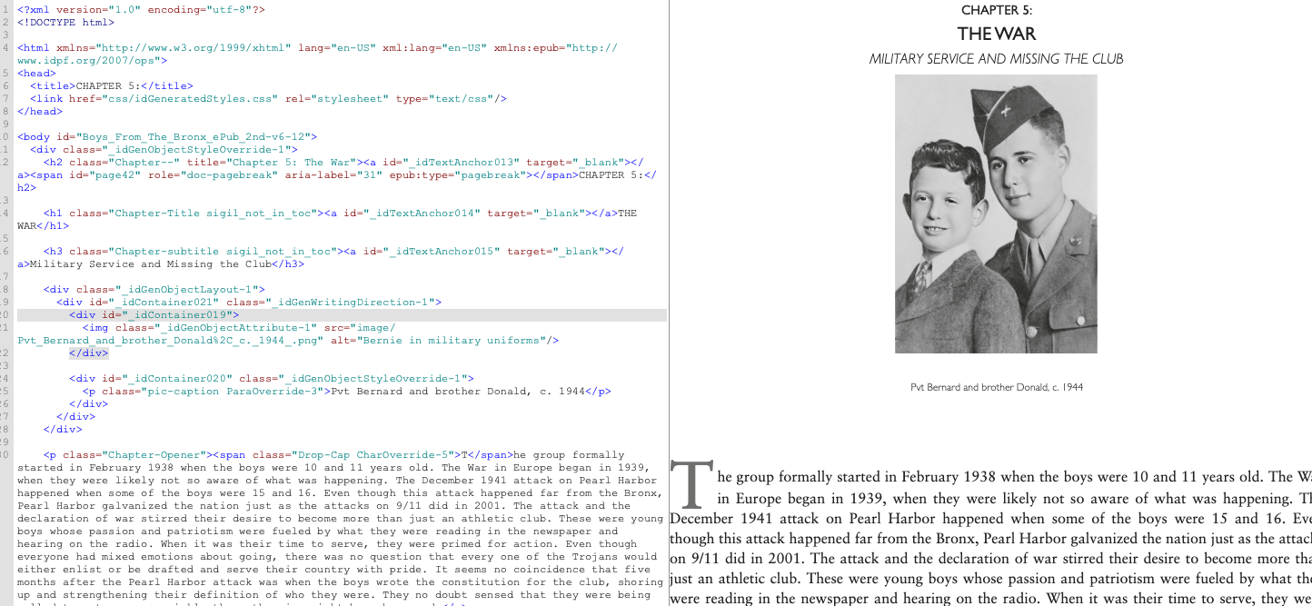 Here is code from beginning of page through part of first paragraph: <?xml version="1.0" encoding="utf-8"?> <!DOCTYPE html> <html xmlns="http://www.w3.org/1999/xhtml" lang="en-US" xml:lang="en-US" xmlns:epub="http://www.idpf.org/2007/ops"> <head> <title>CHAPTER 5:</title> <link href="css/idGeneratedStyles.css" rel="stylesheet" type="text/css"/> </head> <body id="Boys_From_The_Bronx_ePub_2nd-v6-12"> <div class="_idGenObjectStyleOverride-1"> <h2 class="Chapter--" title="Chapter 5: The War"><a id="_idTextAnchor013" target="_blank"></a><span id="page42" role="doc-pagebreak" aria-label="31" epub:type="pagebreak"></span>CHAPTER 5:</h2> <h1 class="Chapter-Title sigil_not_in_toc"><a id="_idTextAnchor014" target="_blank"></a>THE WAR</h1> <h3 class="Chapter-subtitle sigil_not_in_toc"><a id="_idTextAnchor015" target="_blank"></a>Military Service and Missing the Club</h3> <div class="_idGenObjectLayout-1"> <div id="_idContainer021" class="_idGenWritingDirection-1"> <div id="_idContainer019"> <img class="_idGenObjectAttribute-1" src="image/Pvt_Bernard_and_brother_Donald%2C_c._1944_.png" alt="Bernie in military uniforms"/> </div> <div id="_idContainer020" class="_idGenObjectStyleOverride-1"> <p class="pic-caption ParaOverride-3">Pvt Bernard and brother Donald, c. 1944</p> </div> </div> </div> <p class="Chapter-Opener"><span class="Drop-Cap CharOverride-5">T</span>he group formally started in February 1938 when the boys were 10 and 11 years old. The War in Europe began in 1939, when they were likely not so aware of what was happening. The December 1941 attack on Pearl Harbor happened when some of the boys were 15 and 16. Even though this |