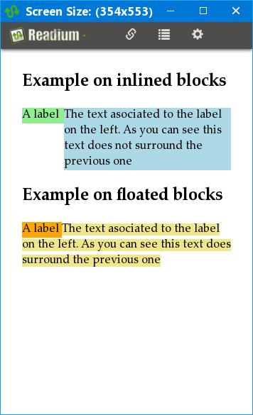 <h2>Example on inlined blocks</h2> <p><span class="col1">A label</span><span class="col2">The text asociated to the label on the left. As you can see this text does not surround the previous one</span></p> <h2>Example on floated blocks</h2> <p><span class="col3">A label</span><span class="col4">The text asociated to the label on the left. As you can see this text does surround the previous one</span></p> Code: