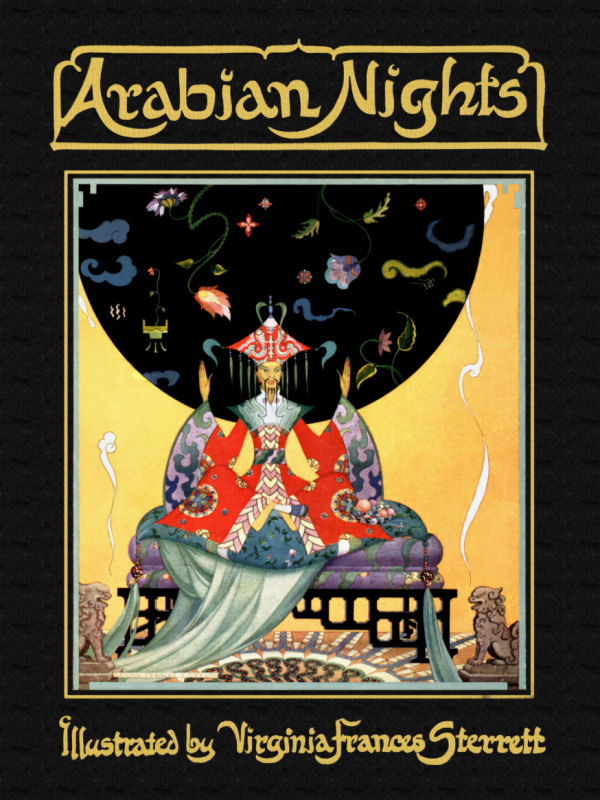 Feeling the urge to get away from it all? No need to leave your easy chair — slip into this book, and visit other lands and other times. Presented here, six of the best-loved tales from The Thousand and One Nights: “The Merchant and the Genie”, “The Caliph Haroun al Raschid”, “Aladdin”, “Ali Baba”, and “Sindbad the Sailor”. The latter three have almost become part of Western folklore, though these were added to the collection only in the 18th century in European adaptations. This book is beautifully illustrated with 16 color plates and 20 B&W drawings; plus chapter decorations. Sterrett’s exquisite pictures transport us to magical landscapes. ================ Hildegarde Hawthorne (September 25, 1871 – December 10, 1952) was an American writer of supernatural and ghost stories, a poet, and biographer. Continuing the lineage of a literary family, she was the granddaughter of Nathaniel Hawthorne and eldest child of Julian Hawthorne. The translator of this collection is not credited. However, the text appears to be based on the 1860 publication Arabian Nights’ Entertainments, a New Edition, Revised, with Notes by the Rev. Geo. Fyler Townsend, M.A. [1814 – 1900], which in turn is “mostly founded on the [1811] version of Dr. Jonathan Scott [1754 – 1829].” Virginia Frances Sterrett was an American artist and illustrator who worked in the Art Nouveau tradition. Her work is fanciful, detailed and often compared to that of Kay Nielsen. Old French Fairy Tales was her first commission, swiftly followed by Nathaniel Hawthorne’s Tanglewood Tales (1921). In failing health, she was able to complete just one further commission prior to her death — her best-known work, considered to be her masterpiece, the suite of illustrations for Arabian Nights (1928). ================ Readers interested in Ms. Sterrett’s art may enjoy other books she illustrated: Tanglewood Tales Old French Fairy Tales ================ This book was first published in 1928. This ebook is in the public domain where copyright is “Life+70” or less, and in the USA. . This work is assumed to be in the Life+70 public domain OR the copyright holder has given specific permission for distribution. Copyright laws differ throughout the world, and it may still be under copyright in some countries. Before downloading, please check your country's copyright laws. If the book is under copyright in your country, do not download or redistribute this work.