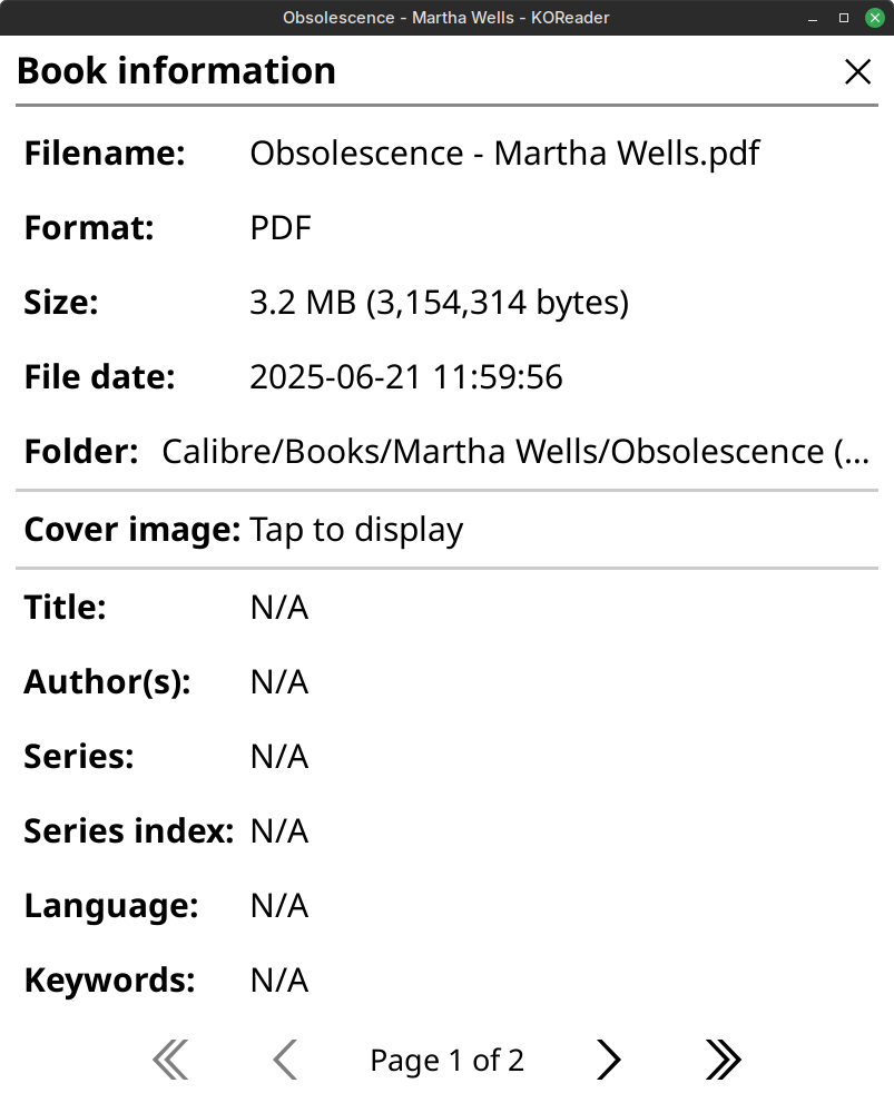 Novella 1: 0.2 Novella 2: 0.5 Book 1: 1.0 Book 2: 2.0 Book 3: 3.0 Book 4: 4.0 Novella 3: 4.5 Book 5: 5.0 Book 6: 6.0 Book 7: 7.0 9 of the 10 are epubs, and Novella 1 is a PDF. When I sort by series in KOReader, it puts the PDF last, even though it's the first number in the series. I tried numbering it as 0.0, and I also added it to a collection, but the sorting is the same in both the file browser and the collection. Is there a way to have KOReader ignore the filetype when sorting? |
