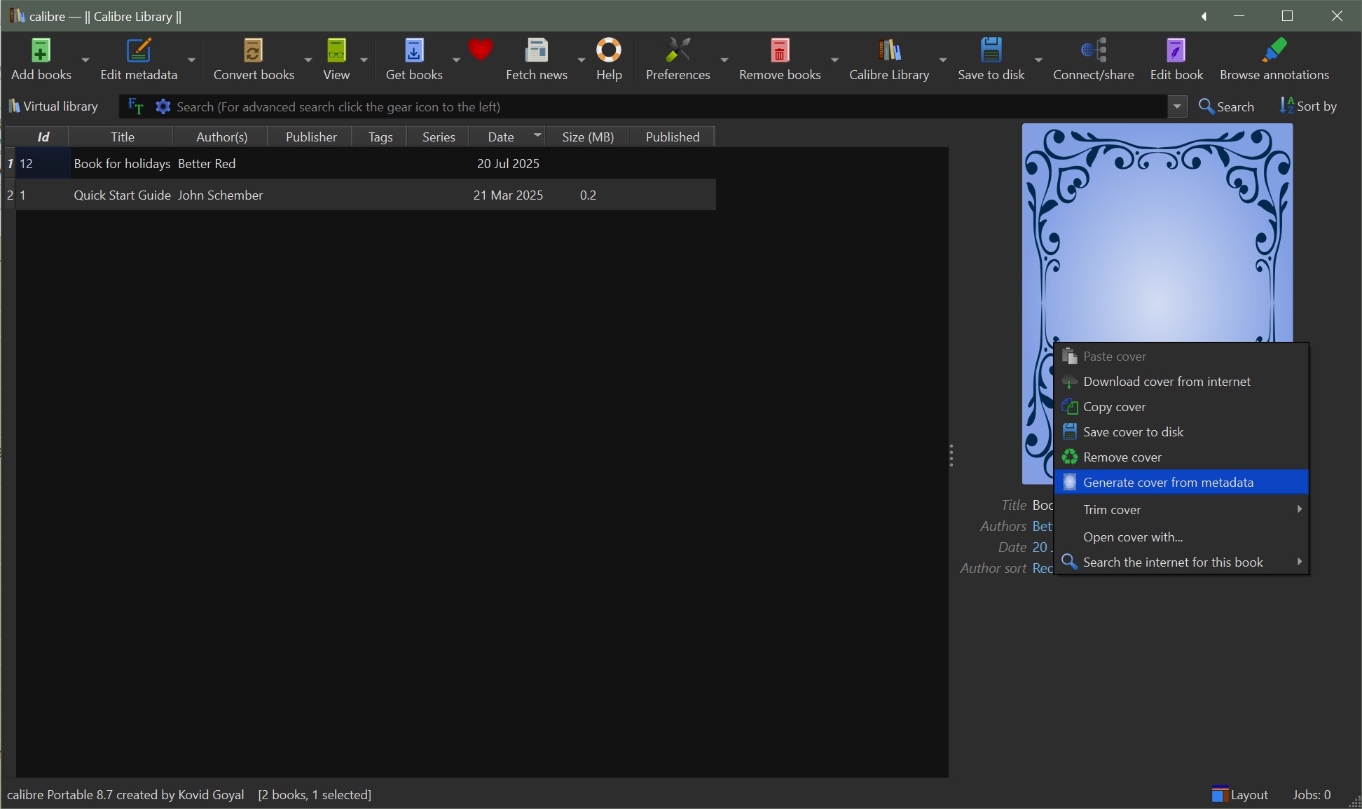 Might be able to do it with an Action Chain. An "If no cover, generate one" option would be a useful addition to Adding Books Preferences. You can Generate it without going to Metadata Edit, viz: BR Last edited by BetterRed; 07-19-2025 at 07:25 PM. Reason: clarity |