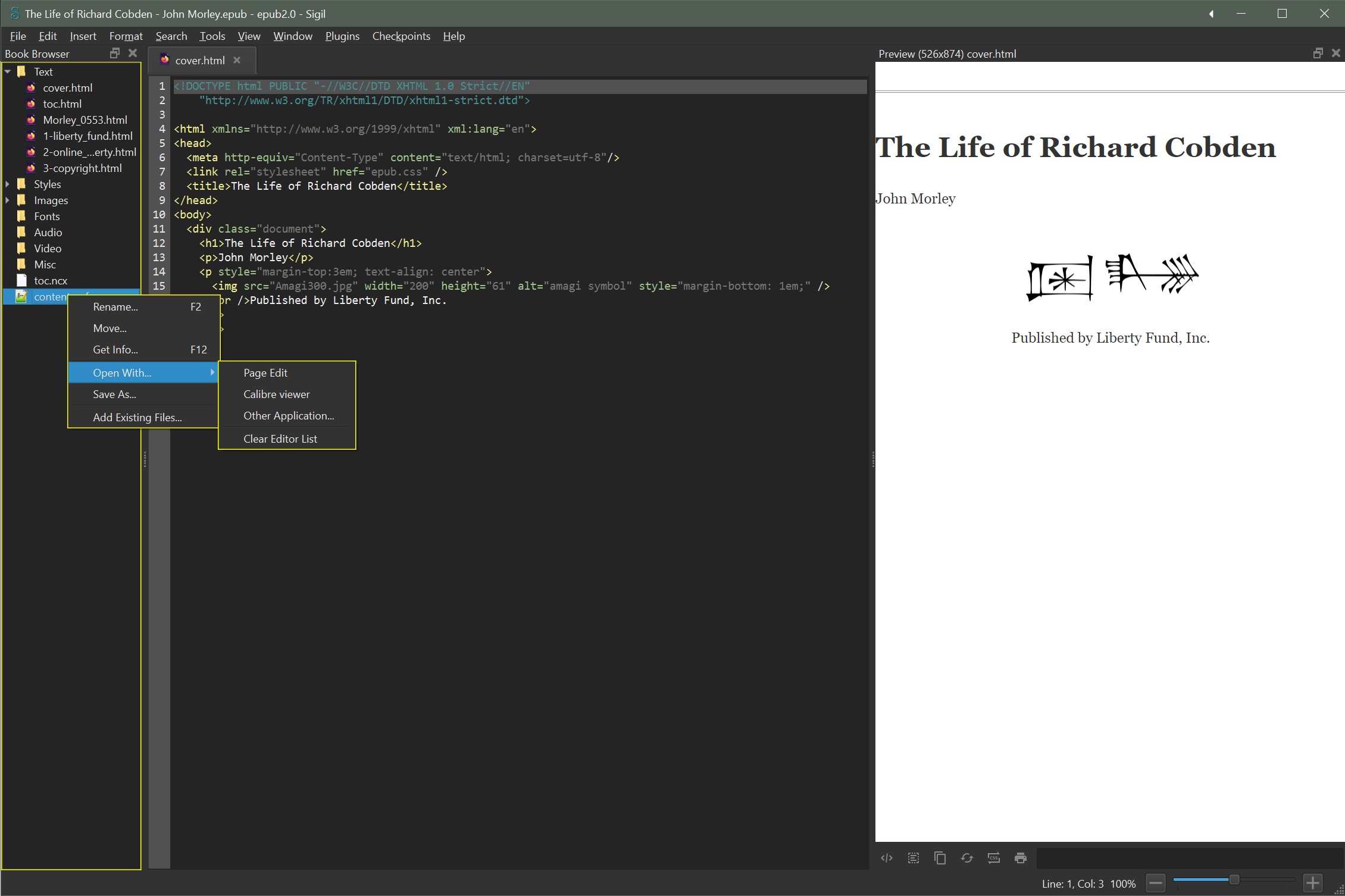 If the Book browser isn't shown (for me, it's rarely hidden) then a shortcut (for me, Ctrl+Shift+B) will show it and give it focus. I'd like to know what the 'quantifiable downsides' are for using Open with for all invocations of external programs on all file types? There's a Preference setting labelled "Set your preferred external xhtml editor:" — that suggests to me that the feature was never intended to be used on opf files. The corresponding shortcut is labelled "Launch External Xhtml Editor", but I can't see an equivalent in the menu bar drop downs. Besides which, it doesn't work for me… and I'm pretty sure it never has, just tried again: When I press F9 with an xhtml file in Codeview nothing happens, i.e. Notepad++ doesn't open. If I select Notepad++ in Open With on the same xhtml file in the Book browser, et voila it opens. While we're on the topic of Book Browser Open With, there's no way to remove a single program, one can remove all for a type and then re-add the programs you want to keep, or delve into sigil_6.ini and edit it. BR |