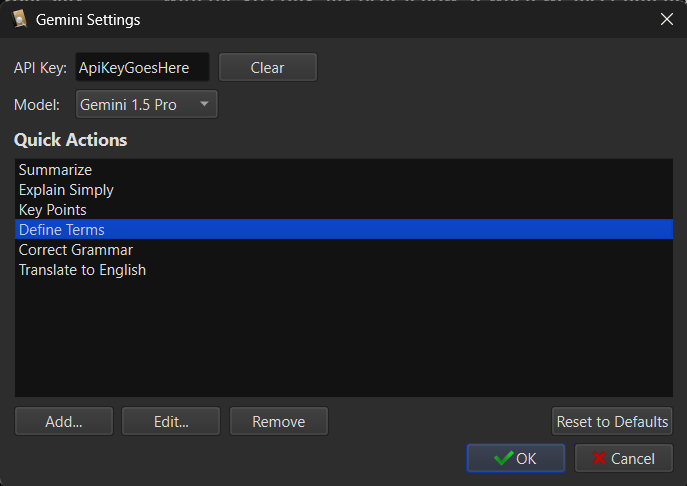 As a long-time user, I admire and appreciate the continuous effort that has made Calibre the indispensable application it is today. My sincere gratitude to all involved. My gratitude aside, now a reflection on the reading experience (that many may be able to attest to). Through countless hours of reading, I've often found myself pausing, grappling with questions a page (or pages) alone cannot answer. Such unanswered questions frequently necessitates reaching for external tools - be it search engines or, increasingly, Large Language Models (LLMs) like ChatGPT - to bring the reader (me) to deeper comprehension. Think extracting the logical structure from an argument in Spinoza's Ethics or identifying experimental findings from a highly technical paper in Science magazine -- sure, one can meticulously re-read, cross-reference, and manually outline these works, to eventually get to the "answers," but an LLM offers that which traditional tools cannot provide: an immediate, context-aware synthesis, one that drastically reduces the cognitive overhead and time spent in the pursuit of genuine understanding; after all, effort saved is focus gained. To expand briefly on the point: unlike static resources that provide isolated facts or definitions (e.g., search engines or dictionaries), LLMs can take a paragraph or passage as complex as Kant's Critique of Pure Reason or as dense as a molecular biology research paper from Nature and instead synthesize its core ideas, explain complex relationships, or rephrase it into simpler term -- and all while retaining important context. It has led me to a realization that I have finally decided to act upon: while having a separate LLM window (ChatGPT, Claude, Grok, Gemini, etc.,) works, imagine the metamorphic potential if this capability were integrated directly into the Calibre application itself. With that vision, I have developed and tested a new feature that integrates Google's Gemini API (which can be abstracted to any compatible LLM) directly into the Calibre E-book Viewer. My aim is to empower users with in-context AI tools, removing the need to leave the reading environment. The results: capability of instant text summarization, clarification of complex topics, grammar correction, translation, and more, enhancing the reading and research experience. Key Features Implemented: