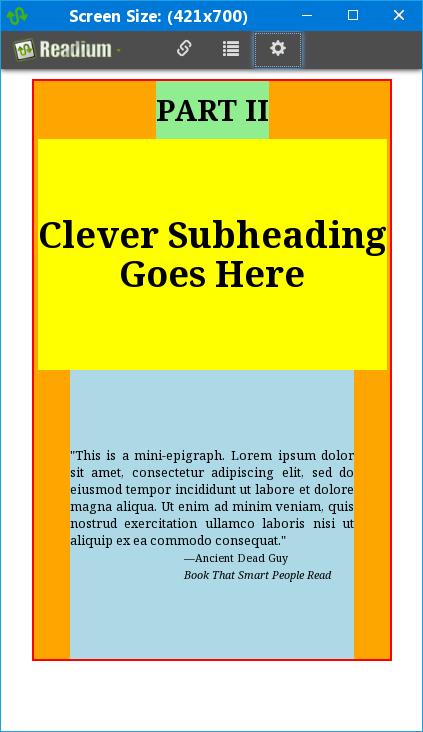 I know that in a reflowable context, I can't make fixed formatting (except as an image). And I also know that the number of lines per screen changes depending on the size of the reader and the size of the screen. What I was wondering is, given these facts, how do you prefer formatting source text that was materially (but not critically) dependent on SOME degree of positional formatting (as in the above-attached example). My question regarding assuming default font sizes and screen sizes, wasn't meant to suggest that there IS a default font size or screen size, merely to wonder if (like phsyical books) ebook publishers/producers do (or should) assume an "ideal" font-size and layout. Obviously, physical publishers didn't/dont' have to worry about "screen" size as a variable, but they do have to consider user reading preferences (and accessibility) in setting their font sizes, right? And then, having done so, they select a font size, knowing it is not a one-size fits all solution: some people may need to wear glasses to comfortably read their books, while others may have to buy an entirely different version that is "large-print". Similarly, an ebook producer might design a book with an idealized font-size/screen-size in mind, or at least a range. I mean, whether you realize it or not, you already are doing it. For example, if you have a reader who sets their font size to 500%, that's potentially going to change the readability of a given book, no matter how conservatively/simply you format it. At 500%, certain words may not fit on a screen, much less fit on it while including paragraph indents, thus making distinguishing paragraphs impossible for that reader. But I also suspect that most ebook producers are not assuming that a reader will set their font size to 500% on a 3-inch-wide screen using software that doesn't incorporate hyphenation. They are idealizing (even if its a range rather than a singular value) the reader's settings. So, to be more explicit: given the example in the first post, what kinds of margins and font sizes would you assume for the three elements in order to maximize readability? Would you, for example, maintain some kind of left/right margins on the epigraphical text? Would you maintain a spacing difference between the main heading and subheading vs subheading and epigraphical text (not to mention font size and font family)? etc., etc., etc. (EDIT: Oh, and regarding the epub2 vs epub3, i guess my question would be do you ever assume that it would be one or the other? or do you format for the least sophisticated format? or do you format for both?) Last edited by ElMiko; 08-05-2025 at 06:25 PM. |