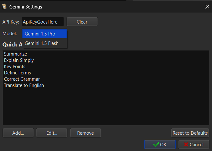 As a long-time user, I admire and appreciate the continuous effort that has made Calibre the indispensable application it is today. My sincere gratitude to all involved. My gratitude aside, now a reflection on the reading experience (that many may be able to attest to). Through countless hours of reading, I've often found myself pausing, grappling with questions a page (or pages) alone cannot answer. Such unanswered questions frequently necessitates reaching for external tools - be it search engines or, increasingly, Large Language Models (LLMs) like ChatGPT - to bring the reader (me) to deeper comprehension. Think extracting the logical structure from an argument in Spinoza's Ethics or identifying experimental findings from a highly technical paper in Science magazine -- sure, one can meticulously re-read, cross-reference, and manually outline these works, to eventually get to the "answers," but an LLM offers that which traditional tools cannot provide: an immediate, context-aware synthesis, one that drastically reduces the cognitive overhead and time spent in the pursuit of genuine understanding; after all, effort saved is focus gained. To expand briefly on the point: unlike static resources that provide isolated facts or definitions (e.g., search engines or dictionaries), LLMs can take a paragraph or passage as complex as Kant's Critique of Pure Reason or as dense as a molecular biology research paper from Nature and instead synthesize its core ideas, explain complex relationships, or rephrase it into simpler term -- and all while retaining important context. It has led me to a realization that I have finally decided to act upon: while having a separate LLM window (ChatGPT, Claude, Grok, Gemini, etc.,) works, imagine the metamorphic potential if this capability were integrated directly into the Calibre application itself. With that vision, I have developed and tested a new feature that integrates Google's Gemini API (which can be abstracted to any compatible LLM) directly into the Calibre E-book Viewer. My aim is to empower users with in-context AI tools, removing the need to leave the reading environment. The results: capability of instant text summarization, clarification of complex topics, grammar correction, translation, and more, enhancing the reading and research experience. Key Features Implemented: