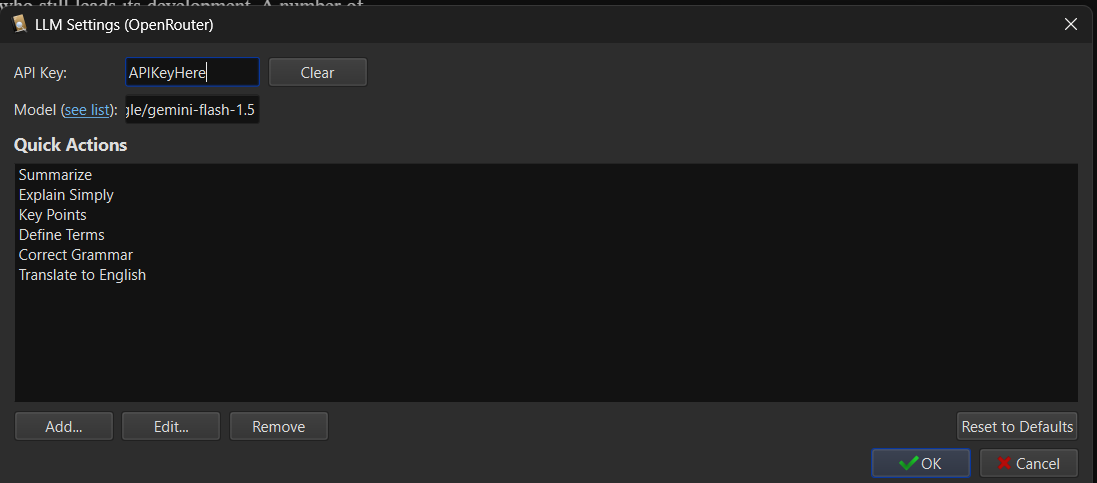 As a long-time user, I admire and appreciate the continuous effort that has made Calibre the indispensable application it is today. My sincere gratitude to all involved. My gratitude aside, now a reflection on the reading experience (that many may be able to attest to). Through countless hours of reading, I've often found myself pausing, grappling with questions a page (or pages) alone cannot answer. Such unanswered questions frequently necessitates reaching for external tools - be it search engines or, increasingly, Large Language Models (LLMs) like ChatGPT - to bring the reader (me) to deeper comprehension. Think extracting the logical structure from an argument in Spinoza's Ethics or identifying experimental findings from a highly technical paper in Science magazine -- sure, one can meticulously re-read, cross-reference, and manually outline these works, to eventually get to the "answers," but an LLM offers that which traditional tools cannot provide: an immediate, context-aware synthesis, one that drastically reduces the cognitive overhead and time spent in the pursuit of genuine understanding; after all, effort saved is focus gained. To expand briefly on the point: unlike static resources that provide isolated facts or definitions (e.g., search engines or dictionaries), LLMs can take a paragraph or passage as complex as Kant's Critique of Pure Reason or as dense as a molecular biology research paper from Nature and instead synthesize its core ideas, explain complex relationships, or rephrase it into simpler term -- and all while retaining important context. It has led me to a realization that I have finally decided to act upon: while having a separate LLM window (ChatGPT, Claude, Grok, Gemini, etc.,) works, imagine the metamorphic potential if this capability were integrated directly into the Calibre application itself. With that vision, I have developed and tested a new feature that integrates Google's Gemini API (which can be abstracted to any compatible LLM) directly into the Calibre E-book Viewer. My aim is to empower users with in-context AI tools, removing the need to leave the reading environment. The results: capability of instant text summarization, clarification of complex topics, grammar correction, translation, and more, enhancing the reading and research experience. Key Features Implemented: