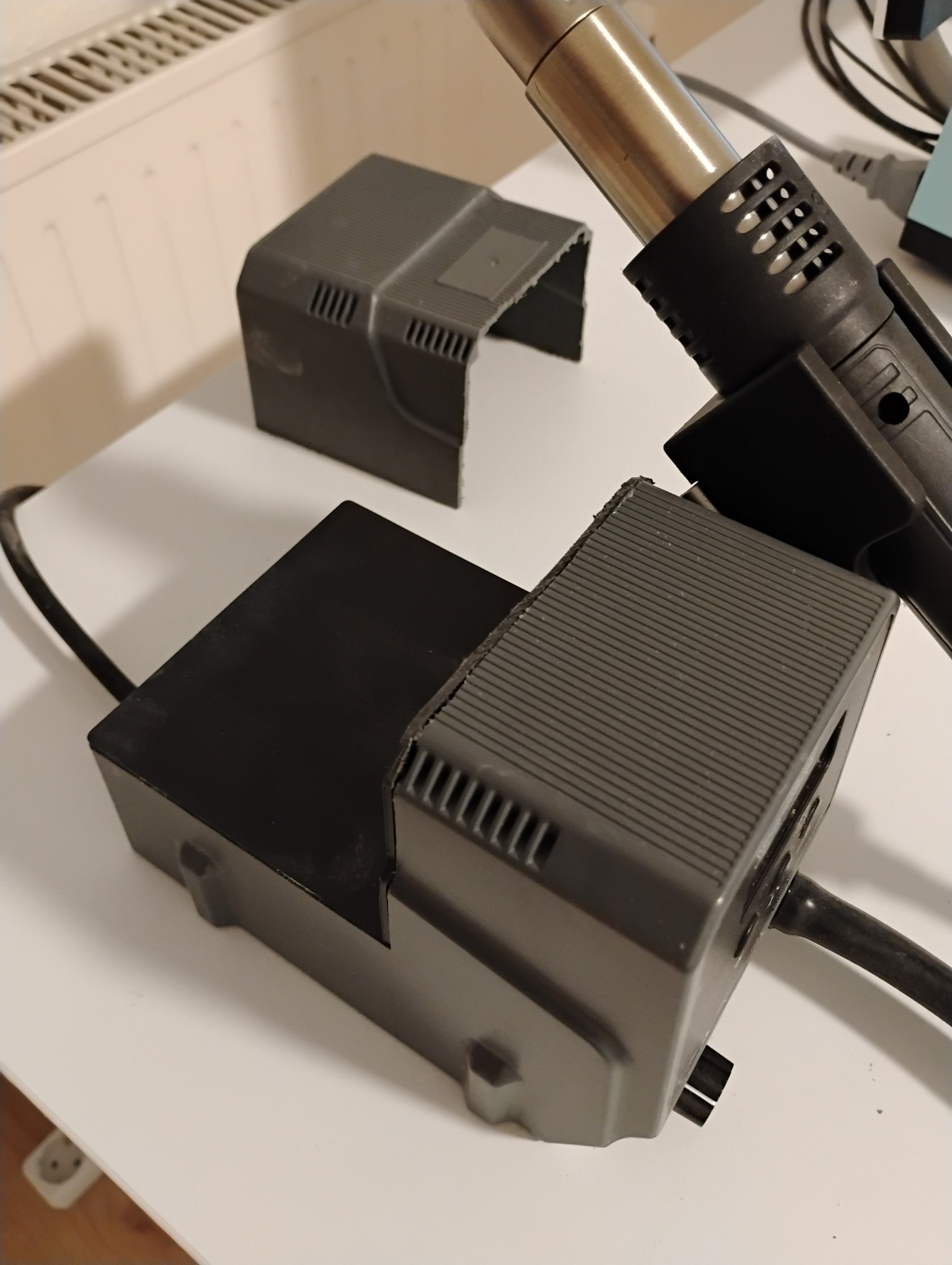 I bought a Velleman VTSS210 hot rework station. I needed a hot air gun for heat shrink and I sometimes work on surface mount components. But I hate to squander money on things that I don't use enough which is why I ended up with Velleman instead of a more professional unit. It actually works ok for what it is. My complaint is with the case. It's overly large, ugly and seems to be trying to impersonate the professional units with the fan built into the base. I briefly debated 3D printing a whole case but dismissed the idea. So instead I just hacksawed a chunk out of the case and replaced it with two 3D printed faces and globs of hot glue. It's less offensive now.