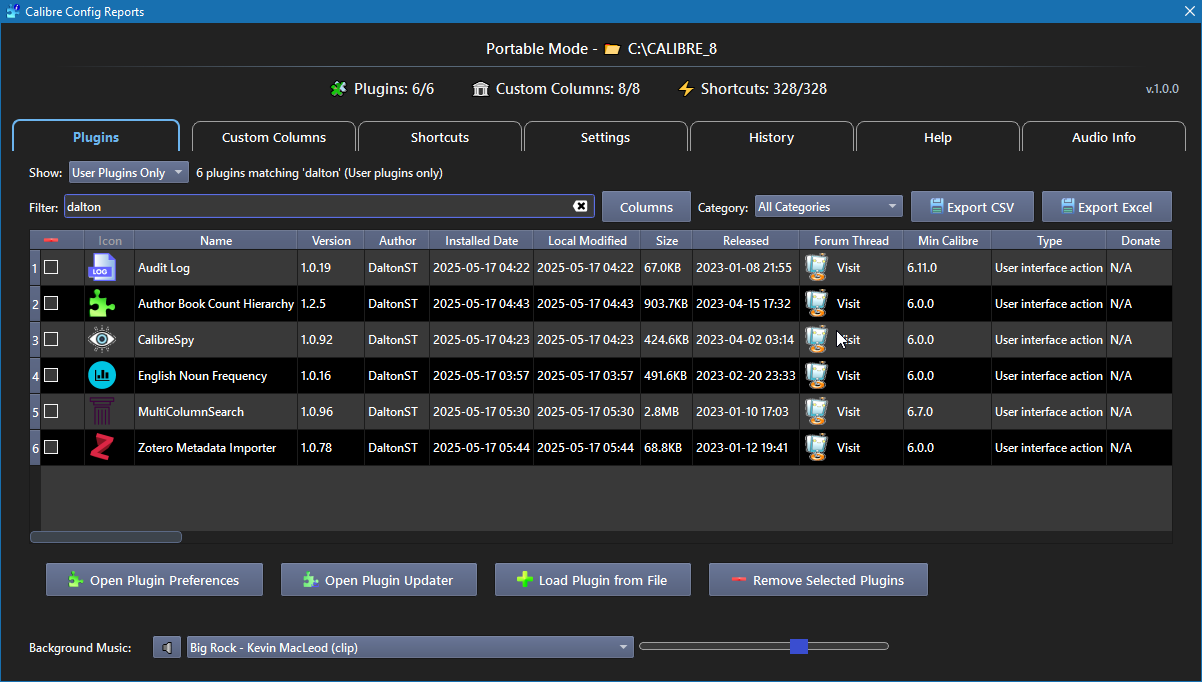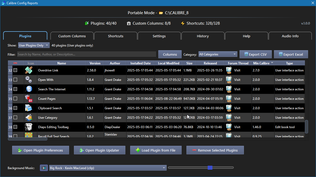 CCR started when I felt the need for a more informative plugin manager. Once that goal was achieved, additional features were added, and what was initially just "Plugin Info" eventually evolved into Calibre Config Reports. The plugin is organized into six specialized tabs, each designed to give you complete visibility and control over different aspects of your Calibre configuration: Plugins Tab - View & manage: All installed plugins with detailed information (name, version, author, type, category) - Filter & search: By category (Calibre ≥8.9), name, author, or description - Actions: Remove plugins, visit forums, copy info, donate to authors - Export: Plugin list data to CSV/XLSX with customizable columns - Install: Load new plugins from ZIP files directly Custom Columns Tab - Display: All custom columns with metadata (name, type, format, template) - Search: Filter by column name, type, or properties - View details: Composite templates, display settings, and format options - Export: Column configurations to CSV/XLSX - Quick access: Copy templates and settings for reuse Shortcuts Tab - Browse: All keyboard shortcuts organized by group and action - Search: Find shortcuts by key combination, action name, or modifier - Navigate: Open Calibre's shortcuts preferences for editing - Export: Shortcut mappings to CSV/XLSX - Organize: Sort and filter by group, action, or key combination Settings Tab - Overview: Calibre main settings organized by Category, Value, UI location and Source - Categories: Installation type, libraries, interface, performance, network settings - Search: Filter settings by category, name, or value - Access: Double-click to open Calibre's main preferences dialog - Export: Complete settings inventory to CSV/XLSX History Tab - Timeline: Recent changes to plugins, some key settings, and Calibre updates - Events: Plugin installs/updates/removals, some key setting changes, version changes - Details: Timestamps, event types, and comprehensive change information - Filter: Search history by event type, plugin name, or details - Export: Historical data to CSV/XLSX for auditing Help Tab - Resources: Direct links to Calibre downloads for all platforms - Documentation: Quick access to user manual sections and tutorials - Support: Plugin forum thread and development support links - About: Plugin version information and description Compatibility - Calibre 6.25 or later - Should work on Windows, macOS, and Linux (I've only tested on Windows, feedback is welcome) Hope you enjoy it. ![]() Release notes Spoiler: