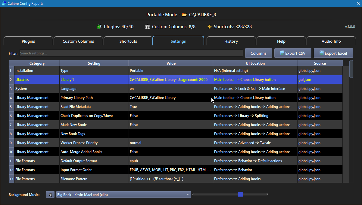 Calibre Config Reports is a comprehensive tool for viewing, searching, and exporting detailed information about your Calibre setup—including installed plugins, custom columns, keyboard shortcuts, and settings. It offers powerful filtering, export options (CSV/XLSX), and easy copy features for troubleshooting or sharing your configuration.