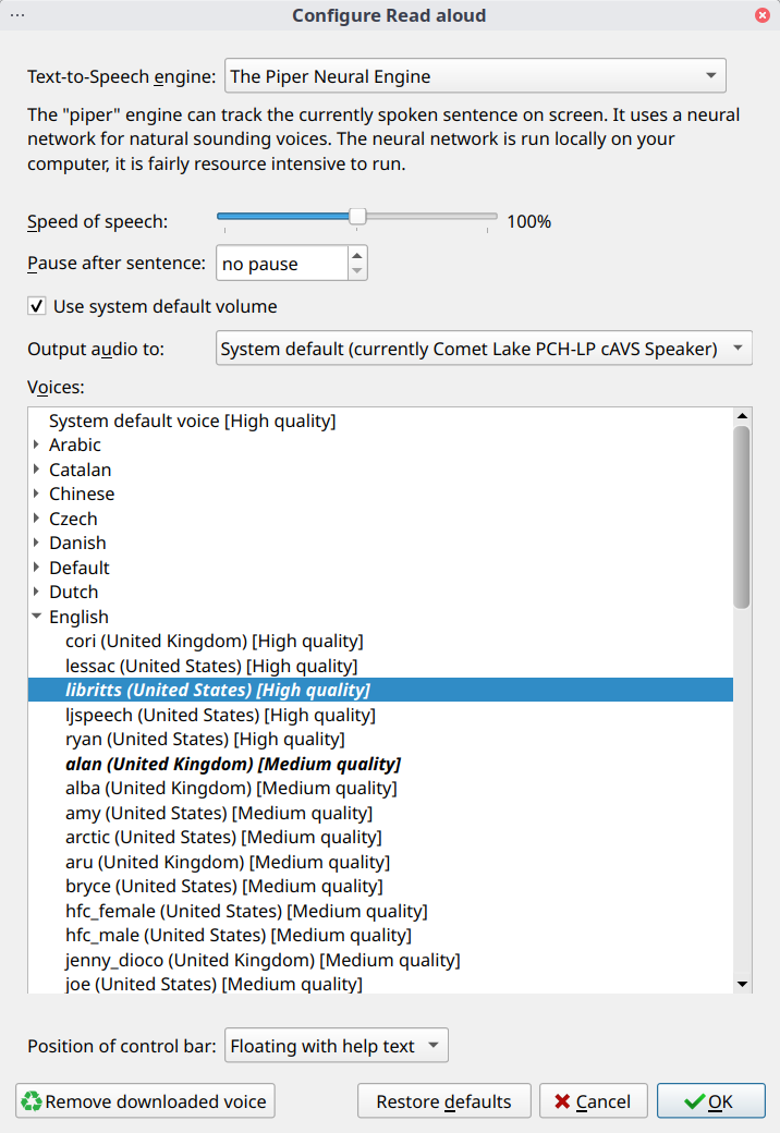 I have a working speech-dispatcher output, using a selected set of Piper voices (English and German), and things like spd-say »This is a test.«, or Foliate work nicely. Now in Calibre’s ebook viewer, when selecting »Read Aloud«, it immediately started downloading a voice called libritts (United States) [High Quality]. I can also download other Piper voices. Where are these stored? I don’t really want to download & store all voices I use twice. When using the suggested The Piper Neural Engine, a reading progress is shown in the book (blue highlight) but I get no sound, whatever output device I select. When switching to my already-installed The Speech Dispatcher Engine, I get a list of my installed voices, can select one, and it reads the book text in the selected voice—but without any indication of position, and no page turning. Would be nice if this can be solved, preferably with the reading progress shown. Last edited by Moonbase59; 08-27-2025 at 05:58 AM. |