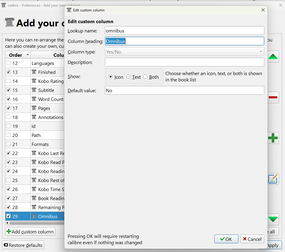 Edit: Just did a quick search and the thread was Kobo: Separate series index (text) and series_index (float)? with the template I'm using in message #16. You will need to create a Omnibus column add a checkmark to the use series number template on the third tab of the KoboTouch configuration and enter the following in the template field: Code: