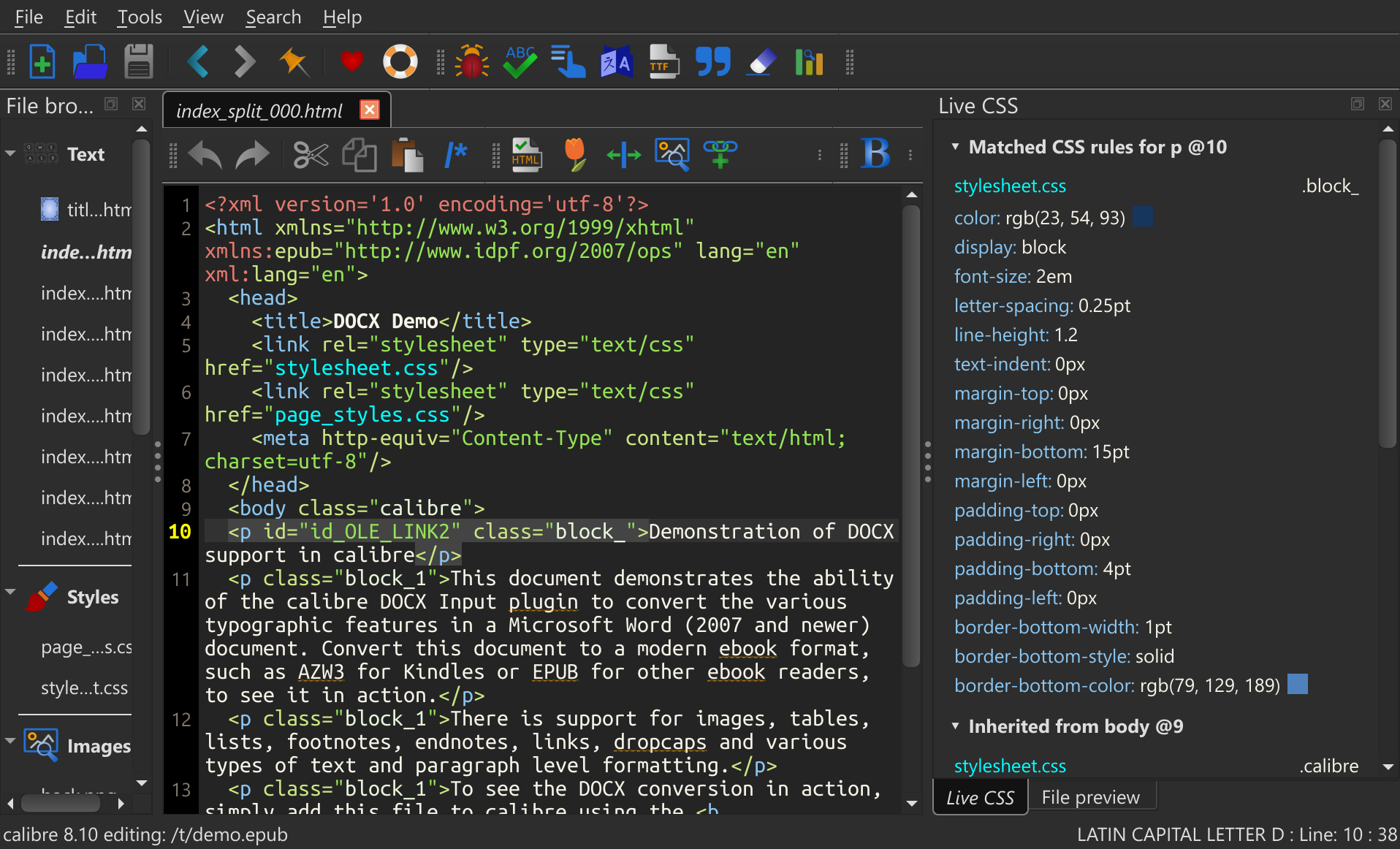 I get that color code in the CSS Live panel no matter where I am in the HTML file. Oddly, my File Preview panel is black and white. I guess that's following my Dark theme, though Edit > Preferences > Editor Settings > Color Scheme is set to pyte-light. I swear that yesterday the whole Editor UI was pyte-light. I'm not sure if I updated to Calibre 8.10 in between the possibly-hallucinated difference or not (I'm on Windows 11).