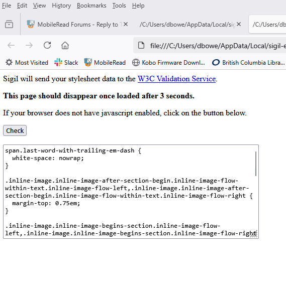 Here is exactly what I am trying: 1. Make sure my default browser is not open or running. 2. open our latest Sigil User Guide in Sigil (which has 2 stylesheets) 3. in BookBrowser I highlight both css files and then right click and select "Validate with W3C" 4. I wait and a browser window with two tabs open and both say pass. This works on Manjaro Linux with FireFox or Chrome as the default browser, and it works on MacOS with Safari as the default browser. So whatever is going on must be Windows specific and interfering with both stylesheets being validated. |