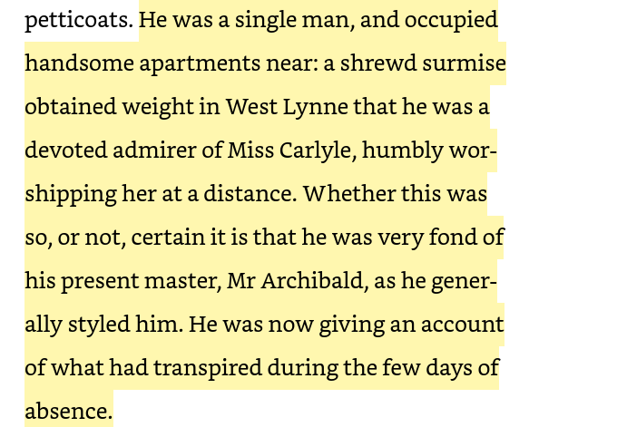 ![]() Yesterday, I was reading the Oxford World's Classics edition of "East Lynne" by Ellen Wood, and I wanted to post a quote online to talk about it. So I went to the Project Gutenberg copy of the book to grab that quote. But the digital text was missing most of the quote! It was missing three sentences about the character Mr. Dill (about 70 words or more in total). Also, my Oxford World Classics edition doesn't include periods after "Mr" and several terms (which is supposed to be the British style), but this abridged edition added periods. I have three old copies of East Lynne. And one was obviously abridged. The size difference is obvious. The nicest one is 596 pages, and it includes the missing text. One is 252 pages -- and the same three sentences are missing. So when someone mentions that they paid for a Penguin Classics edition or an Oxford World's Classics edition, don't assume that they are dunderheads who don't know that they can get free copies from sites like PG. They might want a more academic edition that compares to the original text. And they might want something with footnotes. |
