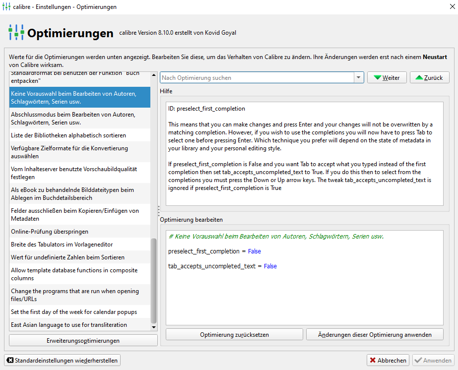 German below. I created a separate column for the genre (as a hierarchy). It's been working great for a while. Unfortunately, I reset something to the default settings, and now no suggestions are offered while typing in the field. Example: I want to assign a book to the genre "Novel." Previously, I only entered "Nov" in the Genre field, and the genre "Fiction & Entertainment.Novels" was immediately suggested. Now, nothing happens. Only when I enter "Fi" do all the genres in the Fiction category appear. Does anyone have any idea how to get this working again? Ich habe eine eigene Spalte mit dem Genre (als Hierarchie) angelegt. Klappt seit längerem wunderbar. Nun habe ich blöderweise irgendwas auf Standardeinstellungen zurückgesetzt und nun werden während der Eingabe in das Feld keine Vorschläge mehr gemacht. Beispiel: Ich möchte ein Buch dem Genre "Roman" zuordnen. Bisher gab ich im Feld Genre nur "Rom" ein und sofort wurde das Genre "Belletristik & Unterhaltung.Romane" vorgeschlagen. Nun kommt gar nichts mehr. Erst wenn ich "Be" eingebe, dann werden alle Genres vorgeschlagen, die eben in der Kategorie Belletristik sind. Hat jemand eine Idee, wie ich das wieder hinbekomme? Heike |