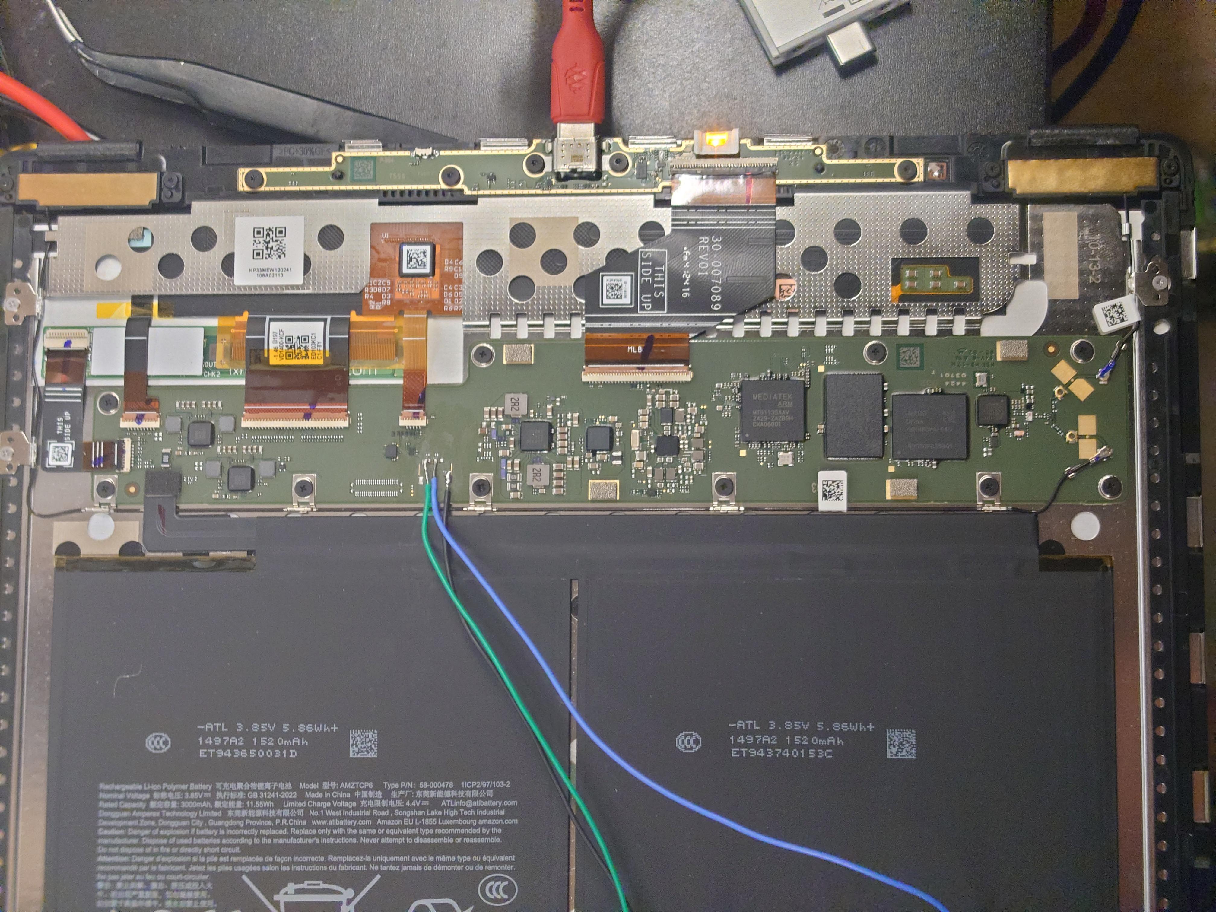 Interestingly enough, the serial port does exist on the Scribe. Hooked up the 3 wires, and it seems to work on PuTTY. However, the output is completely different to other screenshots, it turns into garbage halfway through the boot process, and I don't see any indication of a recovery mode. However, spamming the enter key during the boot process would kick it into Fastboot mode, and the Kindle would report as an Android ADB device. Strangely enough, all the Kindle based fastboot tools can't find the Kindle, but normal Android ADB fastboot tool can communicate with the Kindle just fine. I'm not sure though how to boot it into diagnostics, and that's where I stopped. At this point, I mostly written this Kindle off as spare parts for another Kindle with a broken screen, but I'm curious if anyone has any ideas on how to at least factory reset it, or even get it to a functional state. |