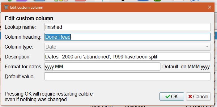 Preferences > Add Your Own Column From there find the column you want to update/make changes to and double click it. Next find the Values column and update/make changes. Click ok. Click Apply. Popup will say to restart calibre. Click restart. When Calibre comes back up, your changes/updates should be in their appropriate column. |
