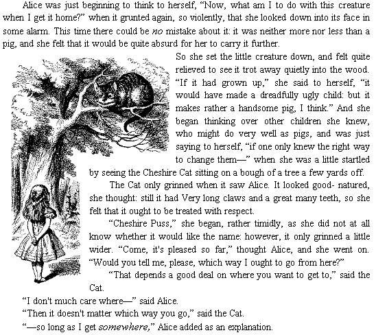 <p><div style="float:left;max-width:170px;width:8.5em;text-align:left; margin:0.25em 0px 0.25em 0.25em"> <img style="display:block;max-width:342px;width:17em;" src="images/alice23a.gif" alt="Alice talks to Cheshire Cat"/> </div> <div style="float:left;max-width:170px;width:8.5em;max-height:220px; height:11em;margin:0.25em 0.25em 0.25em 0px"/> So she set the little creature down, and felt quite relieved to see it trot away quietly into the wood. (...) when she was a little startled by seeing the Cheshire Cat sitting on a bough of a tree a few yards off. </p> div 1 : define the width** as the width of the narrow leg of the image. place the image inside the div, and define the img width** as the actual width of the entire image. div 2 : define the width** as the actual width of image, and define the height as the height of the wide part of the image. this div is an empty placeholder. place text in paragraph following divs. **notice the width is given as max-width in pixels (actual size of the image) and also in ems ; this allows the images to be resized with the text if text size is enlarged or reduced. the 2 divs stack on top of each other and the text wraps around them, first the wide one, then the narrow one. the image overflows its narrow div and is visible beside the text. this will work for left or right side images (just define the float accordingly) with a shape of an upside down L. i imagine it should be possible to make it work for an image with the large bit on the bottom (like a right side up L) but i've not yet tried it out. maybe it would take a third narrow div and add a "clear" to the wide one, to push the wide one down... there might even be other ways to use this idea. Last edited by zelda_pinwheel; 05-10-2009 at 06:31 PM. |
