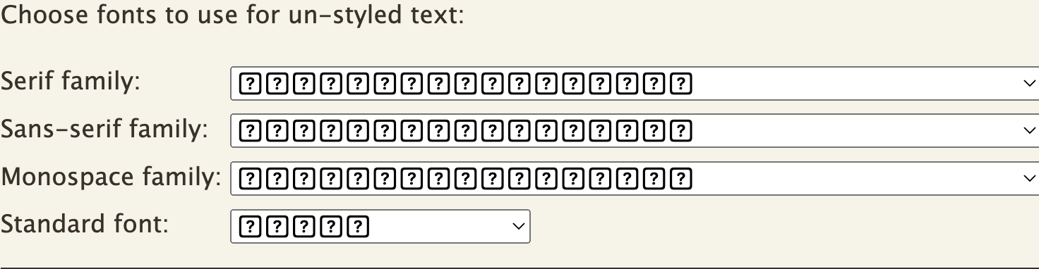 Thanks, but I don't think it's anything to with "corrupt fonts". However, the solution seems to be to reset fonts using the MacOS Font Book. Important: this will remove any fonts installed by the user, though these will be moved from `~/Library/Fonts` to `~/Library/Fonts Removed` and can be added back one by one.
