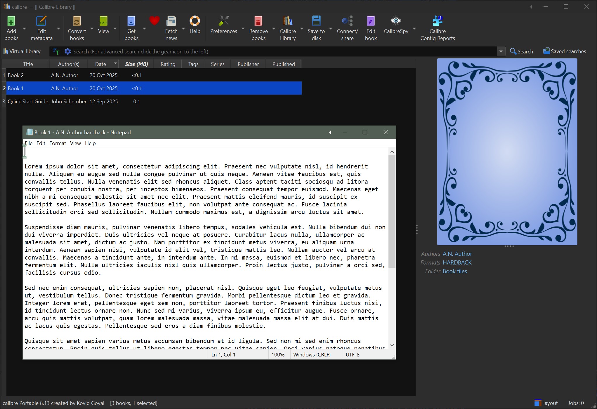 Change the file type selector in the Add books->Add books from a single folder->Select Books dialogue to All files (*.*). I have paperback and hardback file types (they're just text files), which I've set to open in Notepad (via Windows-File Explorer->Open with). As can be seen I name the files with a <title> - <author> template When View these books from calibre Notepad will pop: Moderator Notice I will move this thread to Library Management. BR |