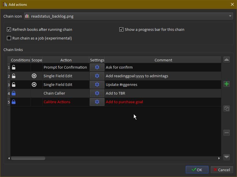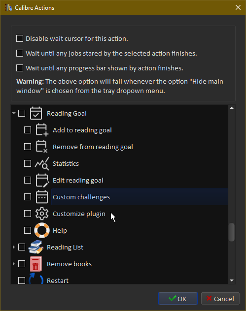 This has nothing to do with the recent change. To be honest, the add/remove challenge menu entry was always created when you first interact with the plugin, because the library_id is not yet available at calibre initialization. Maybe when you first created the chain, you had opened Reading Goal before. Have you recently changed the chain or it just stoped working?