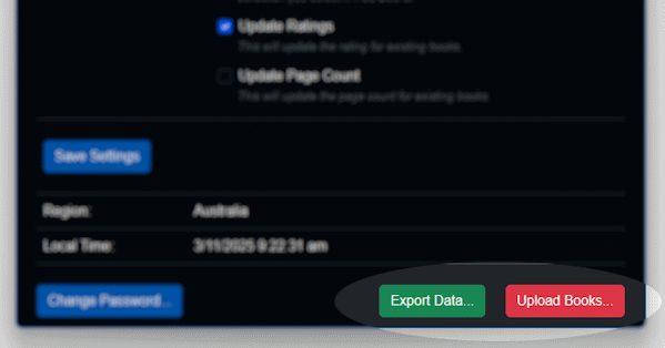 This functionality is accessed from Settings using the "Export Data" and "Upload Books" buttons: Here's how it works: