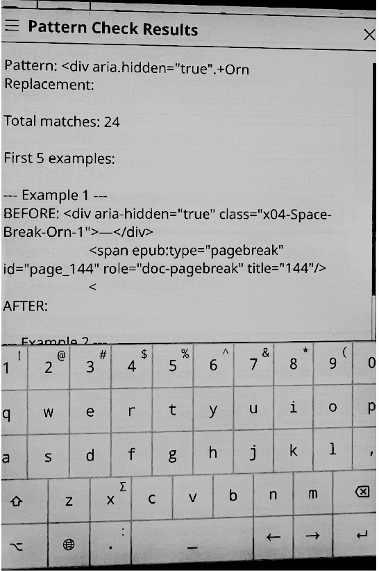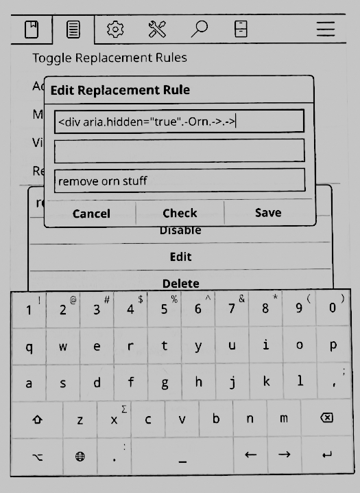 4. Use the "Check" Button! Each rule has a "Check" button that shows you all matches and the before/after results. This will help prevent surprises, 0 matches and broken EPUBs. 5. Lua Patterns Are Different from Standard Regex KOReader uses Lua patterns, not PCRE/standard regex: