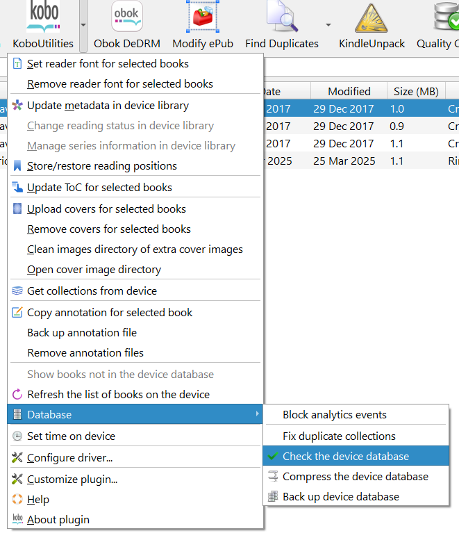 If you haven't upgraded to calibre 8+ as yet, I would recommend opening the KoboTouchExtended configuration and recording/screenshotting the setup since it will not be migrated when you upgrade to calibre 8+. Last edited by DNSB; 06-18-2025 at 02:46 AM. Reason: Added image of Kobo Utilities showing database compress option |