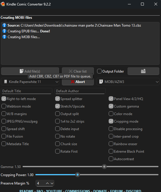 9.2 changes: Fixed webtoon processor Fixed color detection Lots of old bugs fixed like "cannot access gif" and "source directory is empty" ReMarkable Paper Pro Move profile Metadata editor fixes gamma correction default is now 1.0 (disabled) 9.2.1 changes: * fix truncated file read (7.2 regression) * build windows command line versions directly using faster Python 3.11 * Fix png mobi transparency (7.6.0 regression) * color detection even more precise KCC 9.2.2 is now in pre-release * raise webtoon max height and more informative errors * covers are now autocontrasted properly * file fusion added to c2e * maximum resolution raised to 6000x8000 Last edited by axu2; 11-04-2025 at 05:25 PM. |