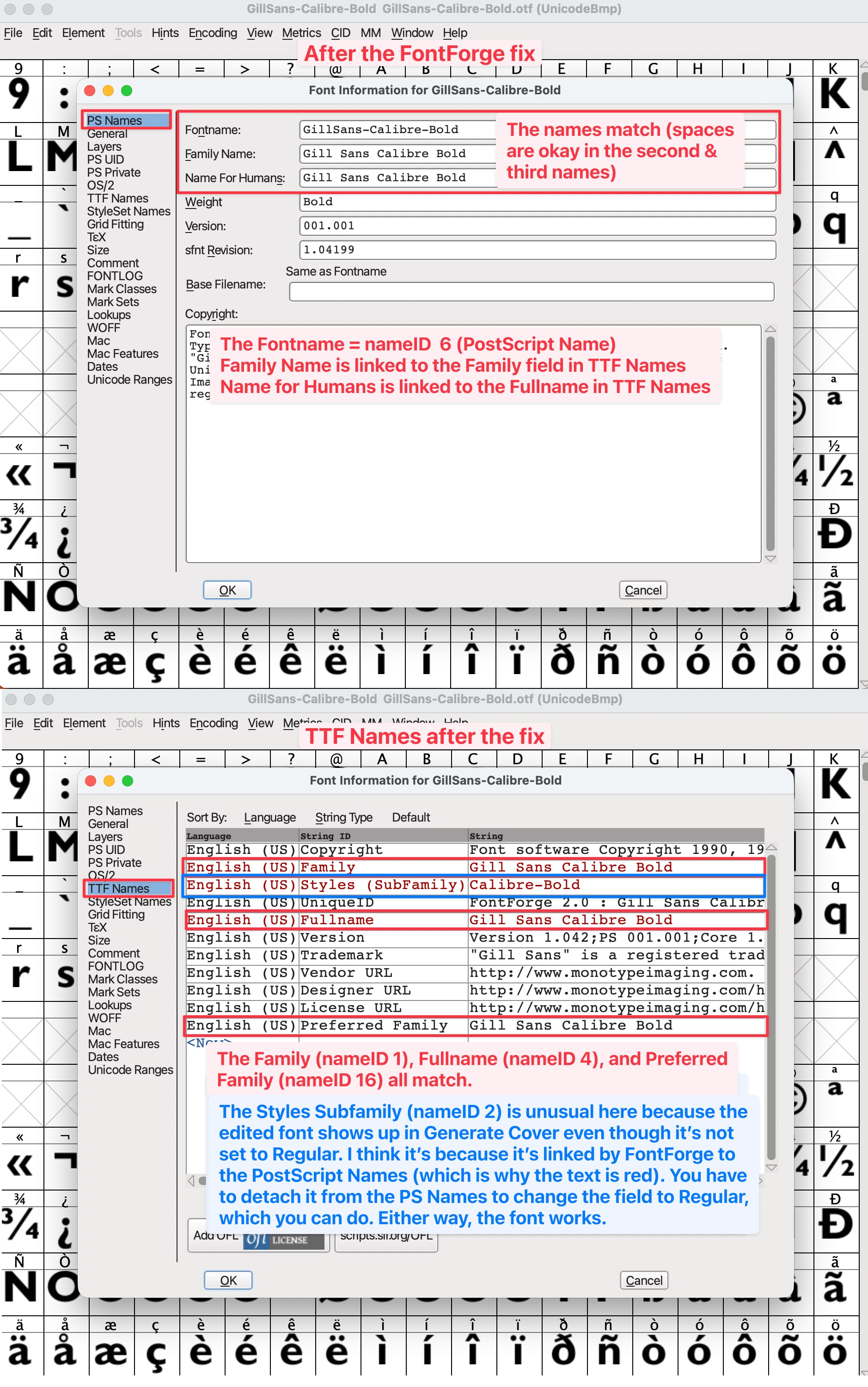 5. Review/edit the following four TTF Names. Family, Fullname, and Preferred Family (if it appears) must match. If your font is already in the Generate Cover menu, leave the Styles string alone. If you’re trying to add a font that’s missing, you’ll also (usually) need to change Styles (Subfamily) to Regular.